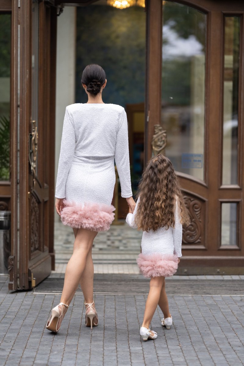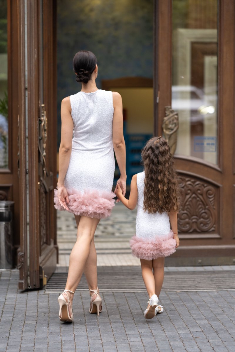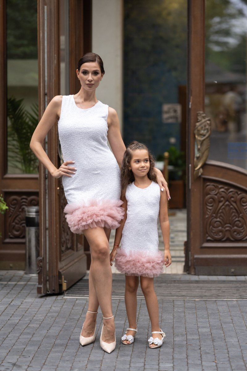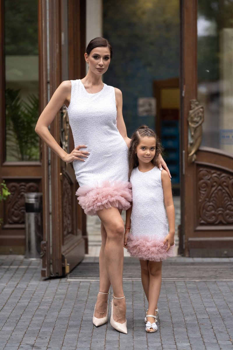 Комплект еднакви рокли за майка и дъщеря с бели пайети и тюл пудра