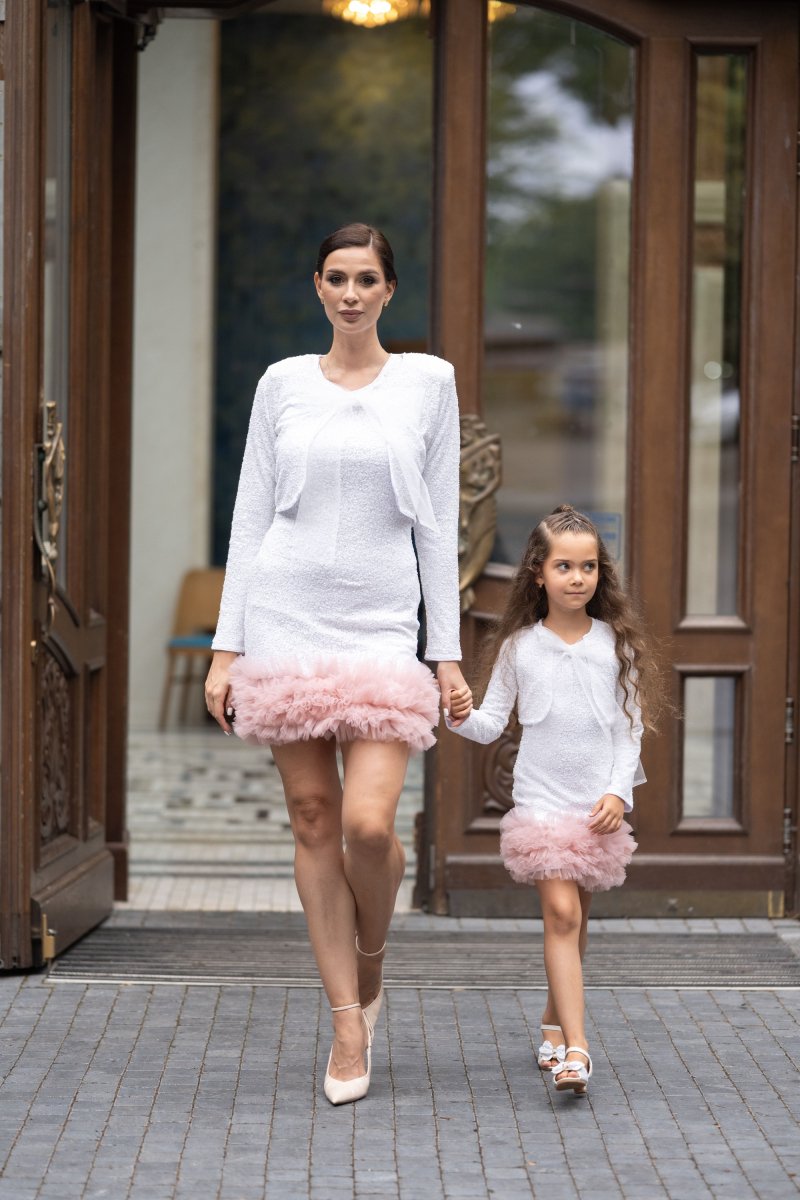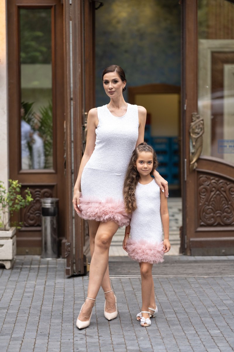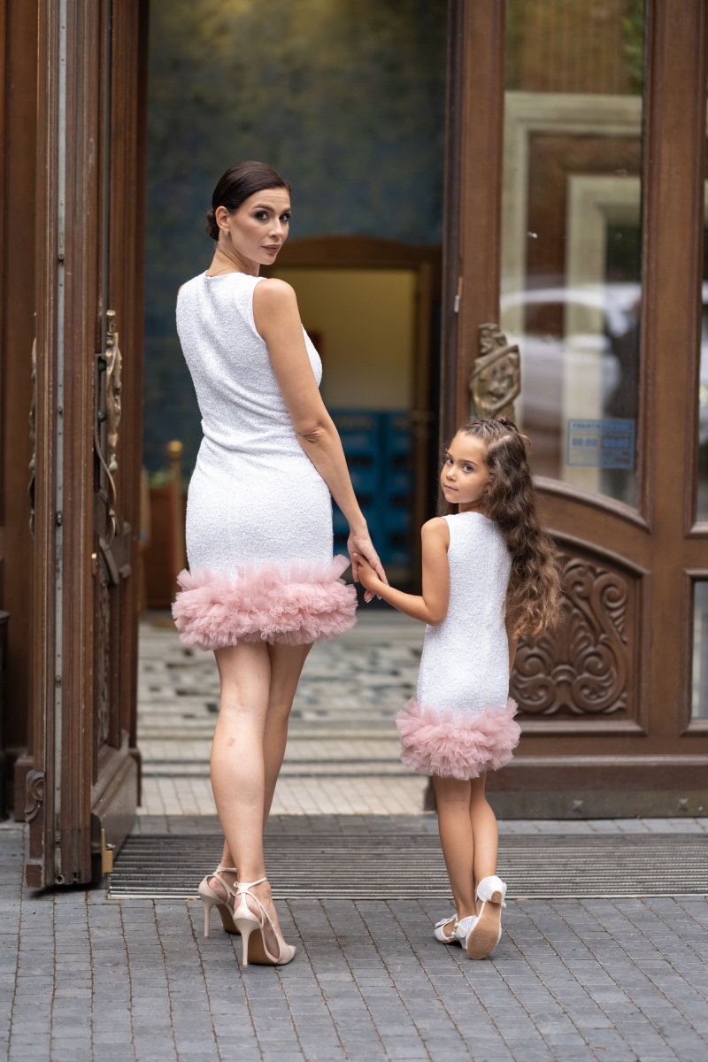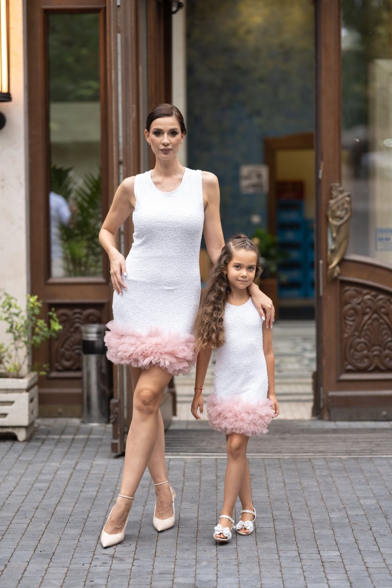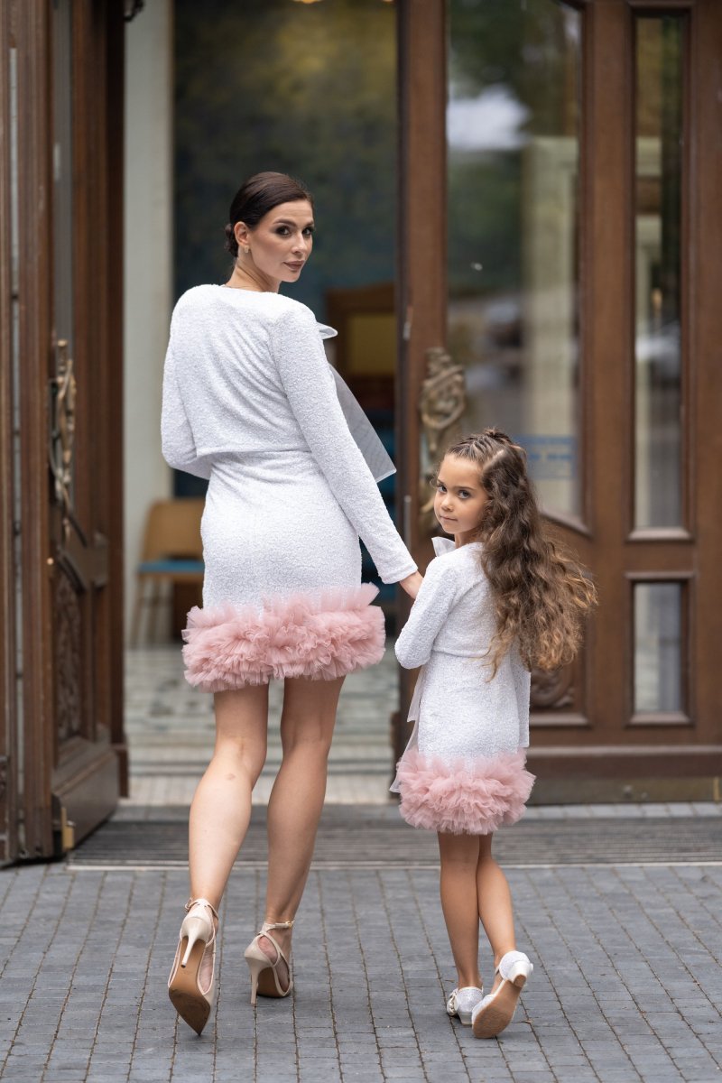 Комплект еднакви рокли за майка и дъщеря с бели пайети и тюл пудра
