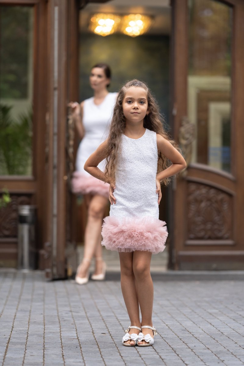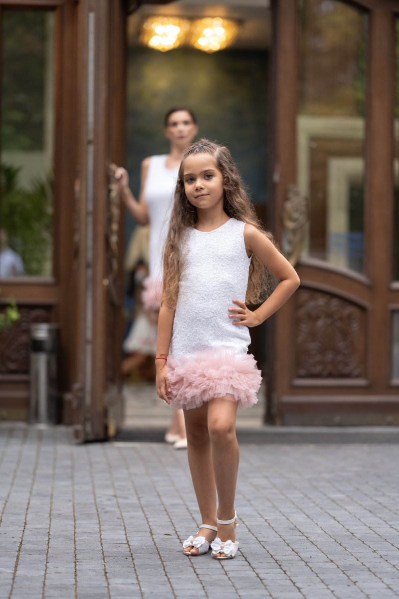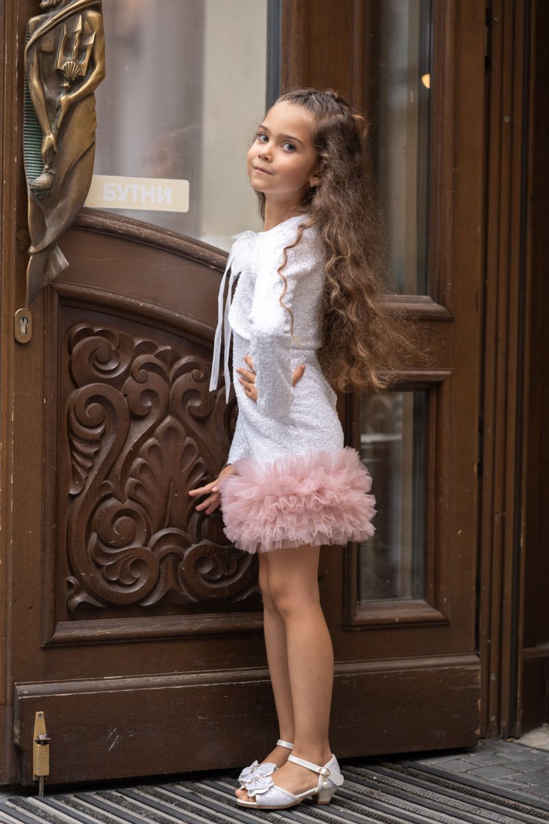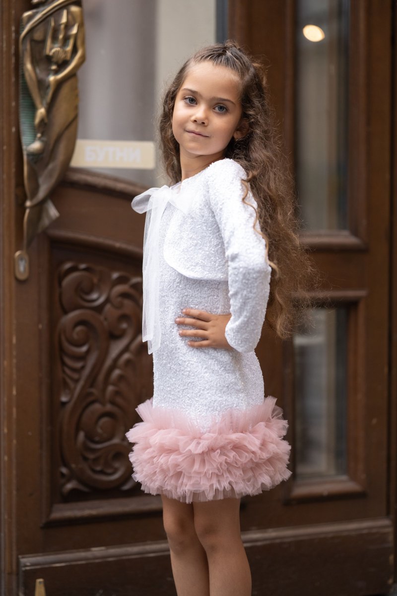 Представяме ви детската бяла рокля от пайети с розов тюл, създадена за специални моменти, в които искаш дъщеря ти да изглежда вълшебно.
