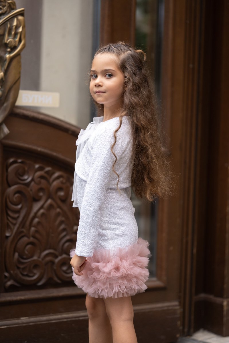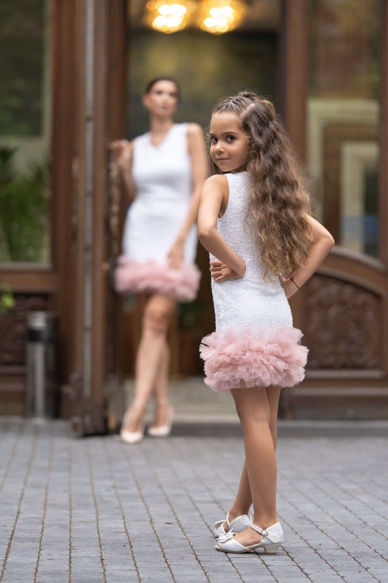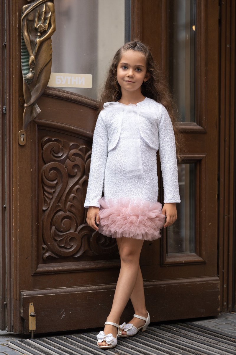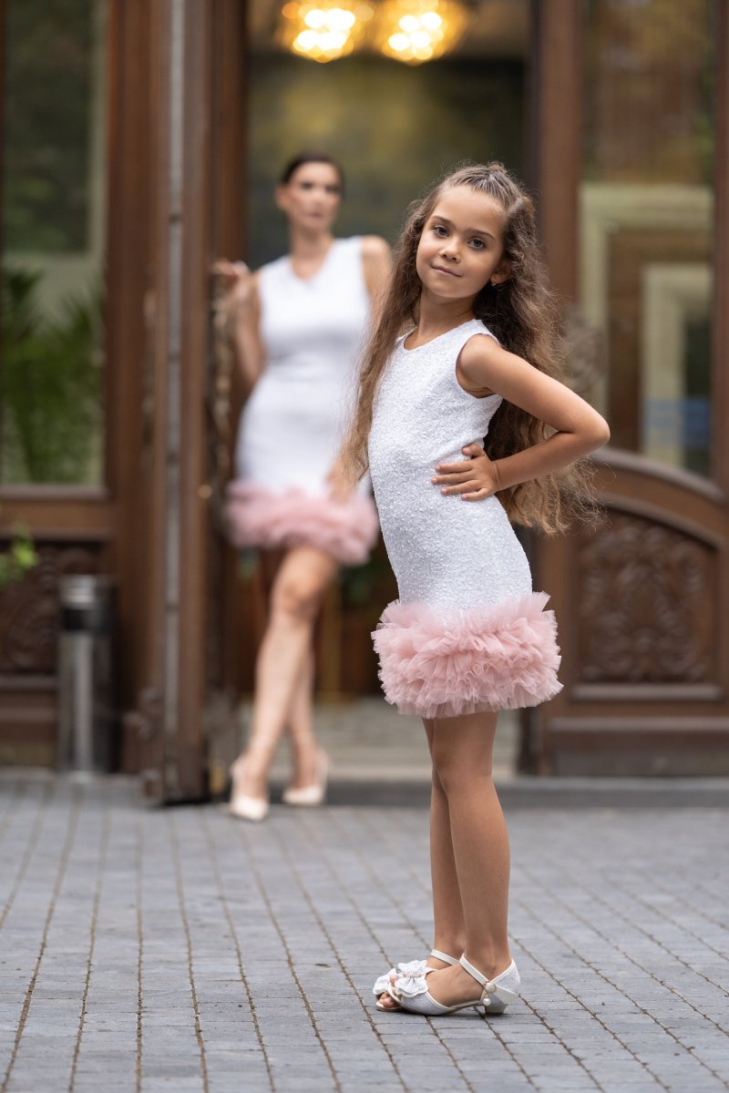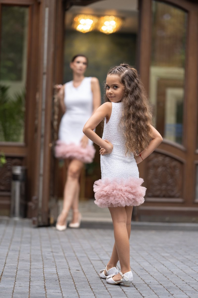 Представяме ви детската бяла рокля от пайети с розов тюл, създадена за специални моменти, в които искаш дъщеря ти да изглежда вълшебно.