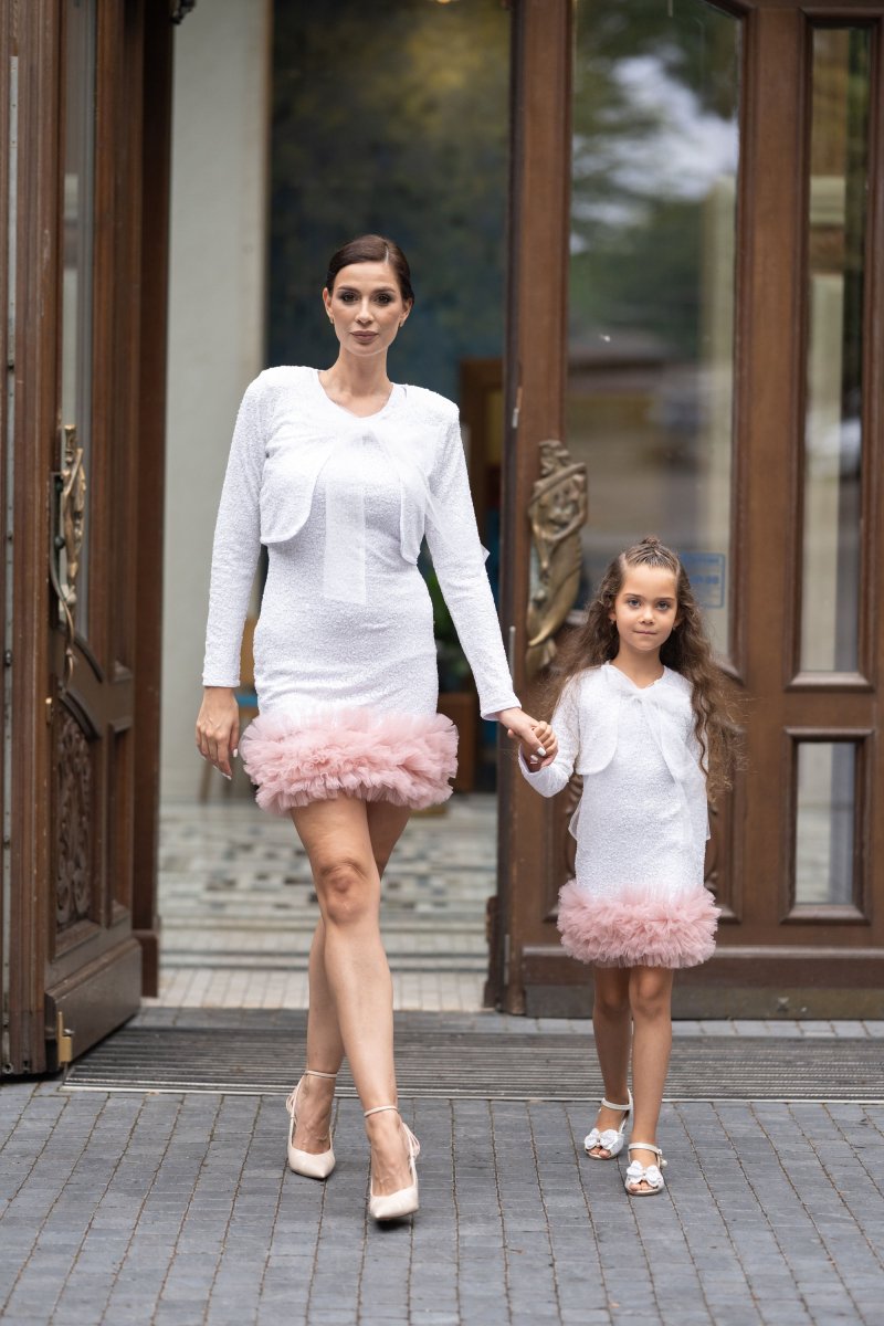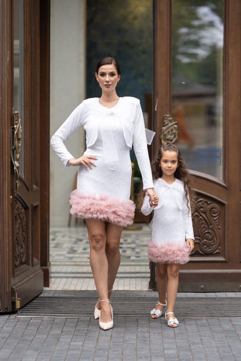Комплект еднакви бели сака за майка и дъщеря с бели пайети