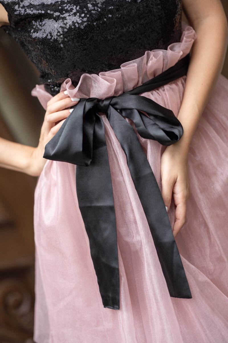 Дамската рокля комбинира ефектна горна част от черни пайети с нежен розов многопластов тюл, който създава лек и женствен силует.