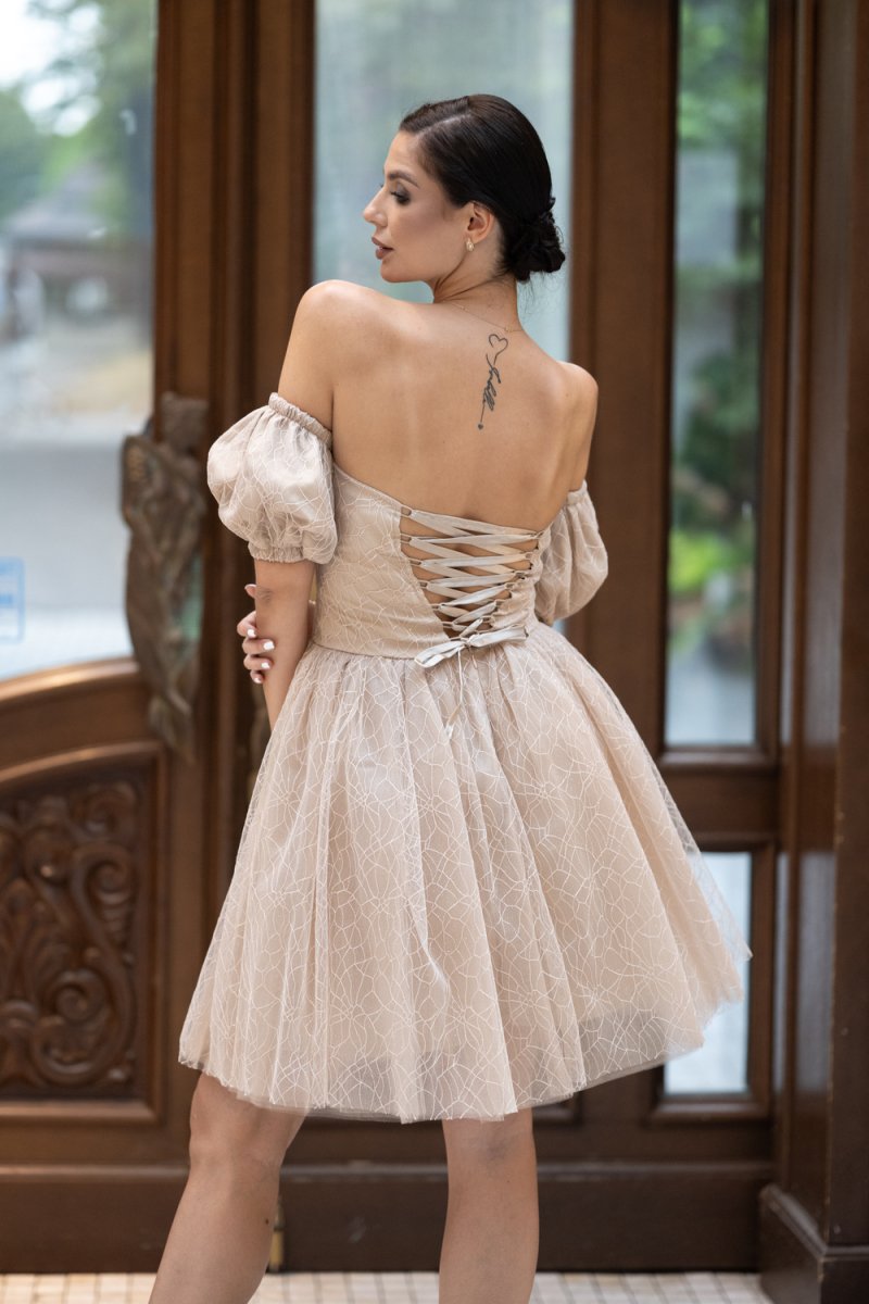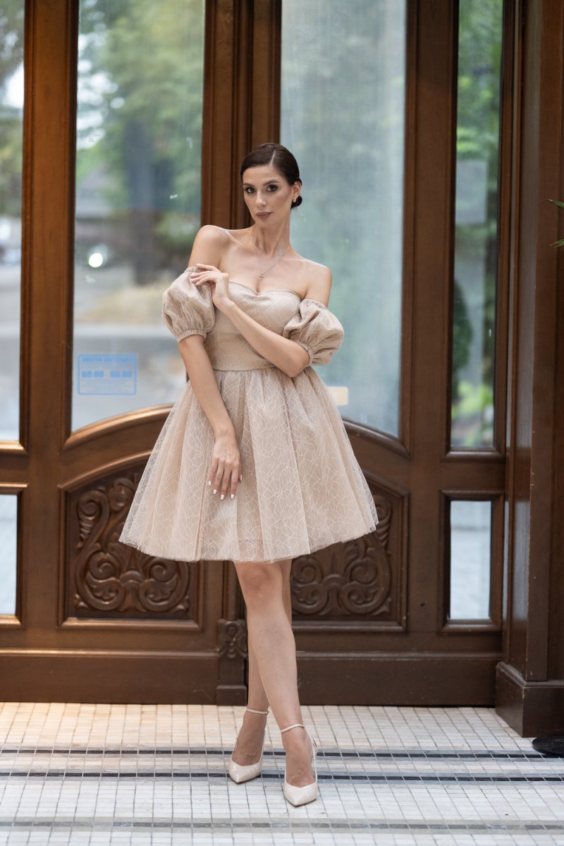 Дамският модел е изработен от фин бежов тюл с деликатен релеф, украсен с обемни ръкави и открити рамене. Корсетният гръб с връзки подчертава талията и създава безупречен силует.
