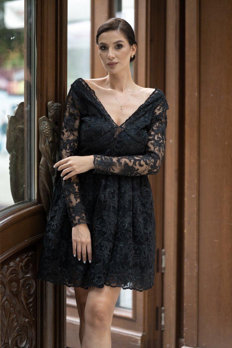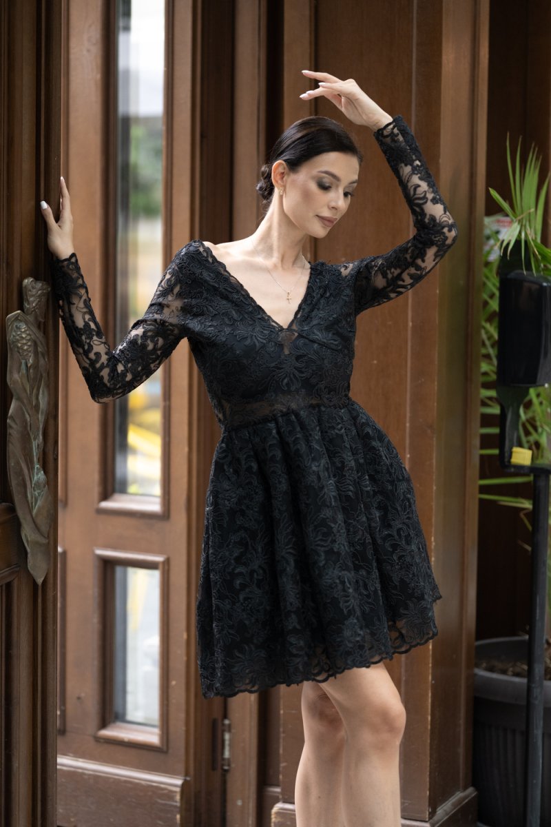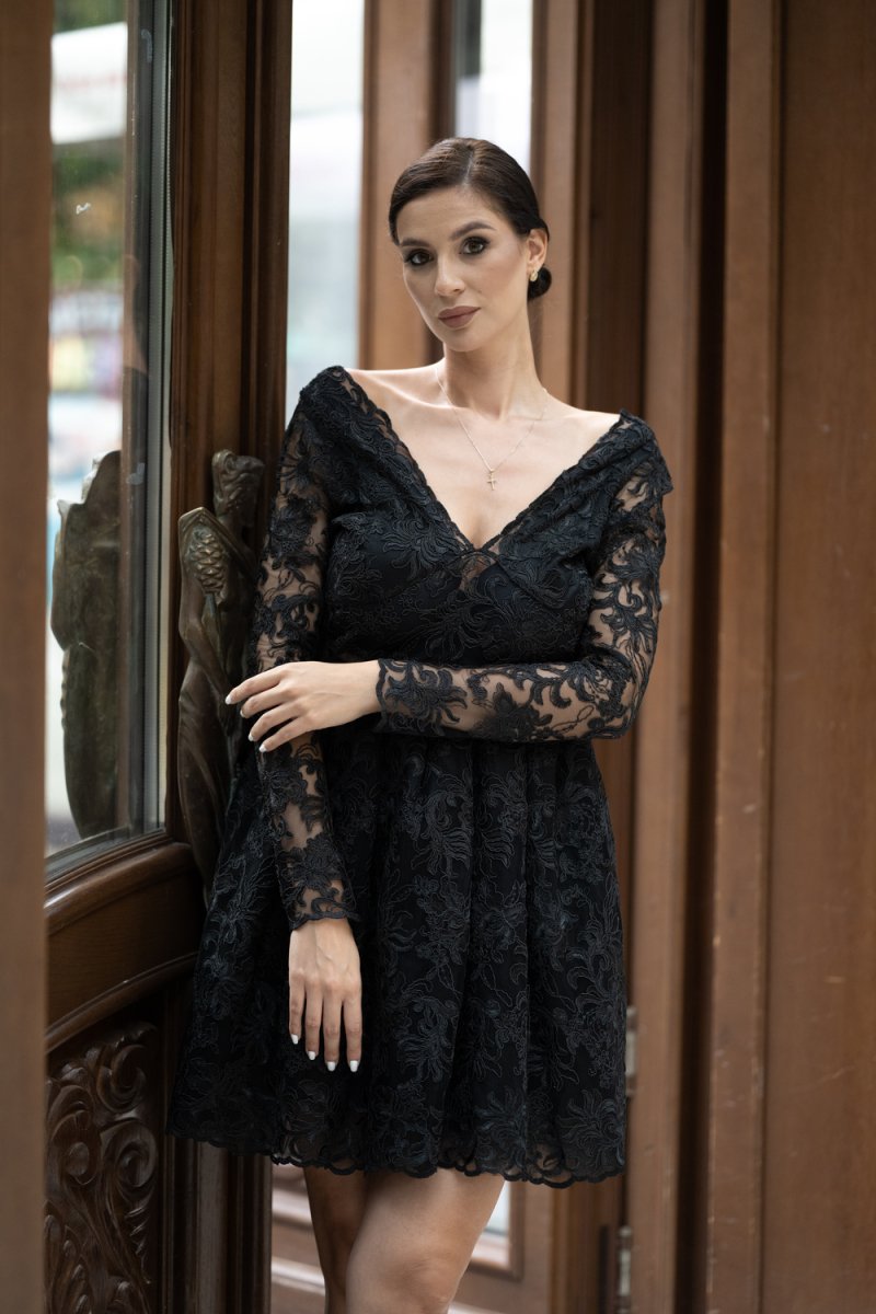 Дамската рокля е изработена от луксозна черна дантела с дълги ръкави, деколте „V“ и корсетен гръб с връзки. Подплатата осигурява комфорт, а разкроената пола създава ефирен силует.