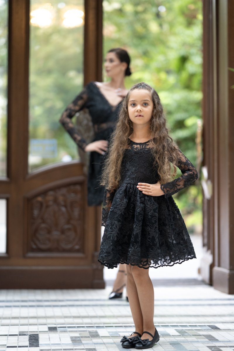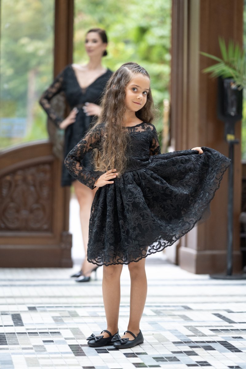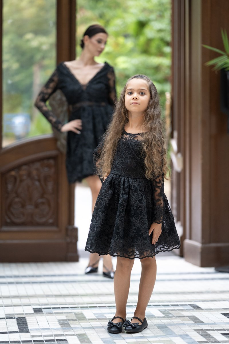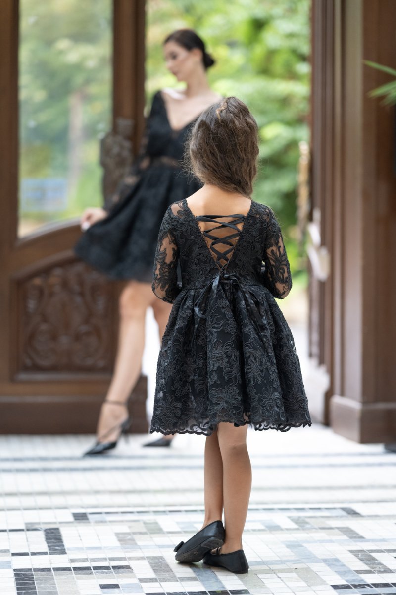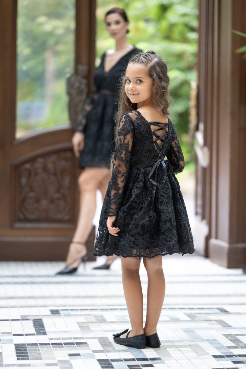 Детската рокля е изработена от луксозна черна дантела с подплата, която осигурява удобство. Дългите ръкави и разкроената пола създават стилен и същевременно игрив силует, а гърбът с връзки добавя модерен акцент.