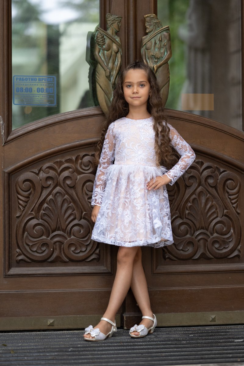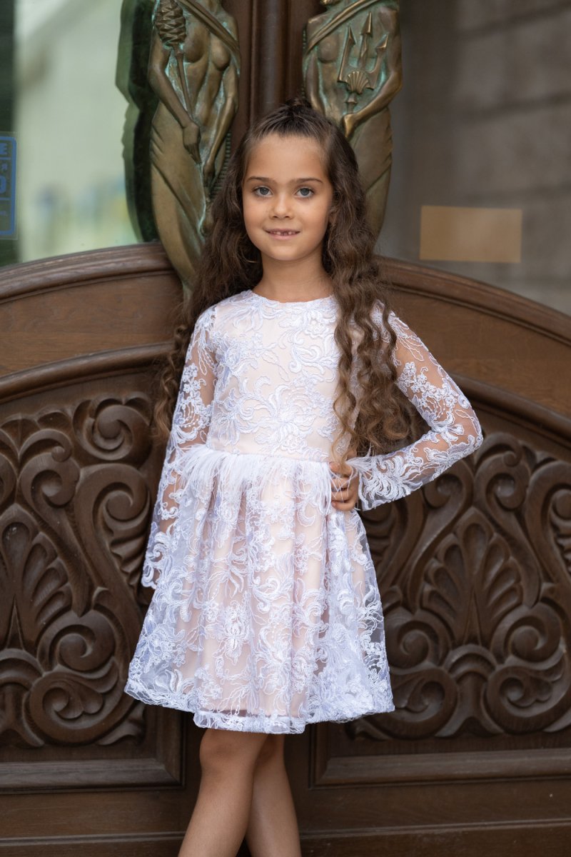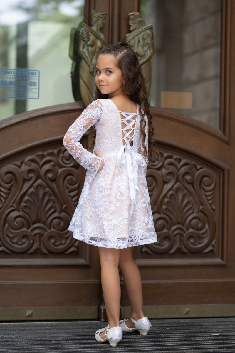 Детската рокля е изработена от луксозна бяла дантела върху прасковена подплата. Акцентът са нежните бели перца, поставени в талията, които добавят изтънчен и празничен завършек. Моделът е с дълъг дантелен ръкав, разкроена пола и връзки на гърба за перфектна форма.