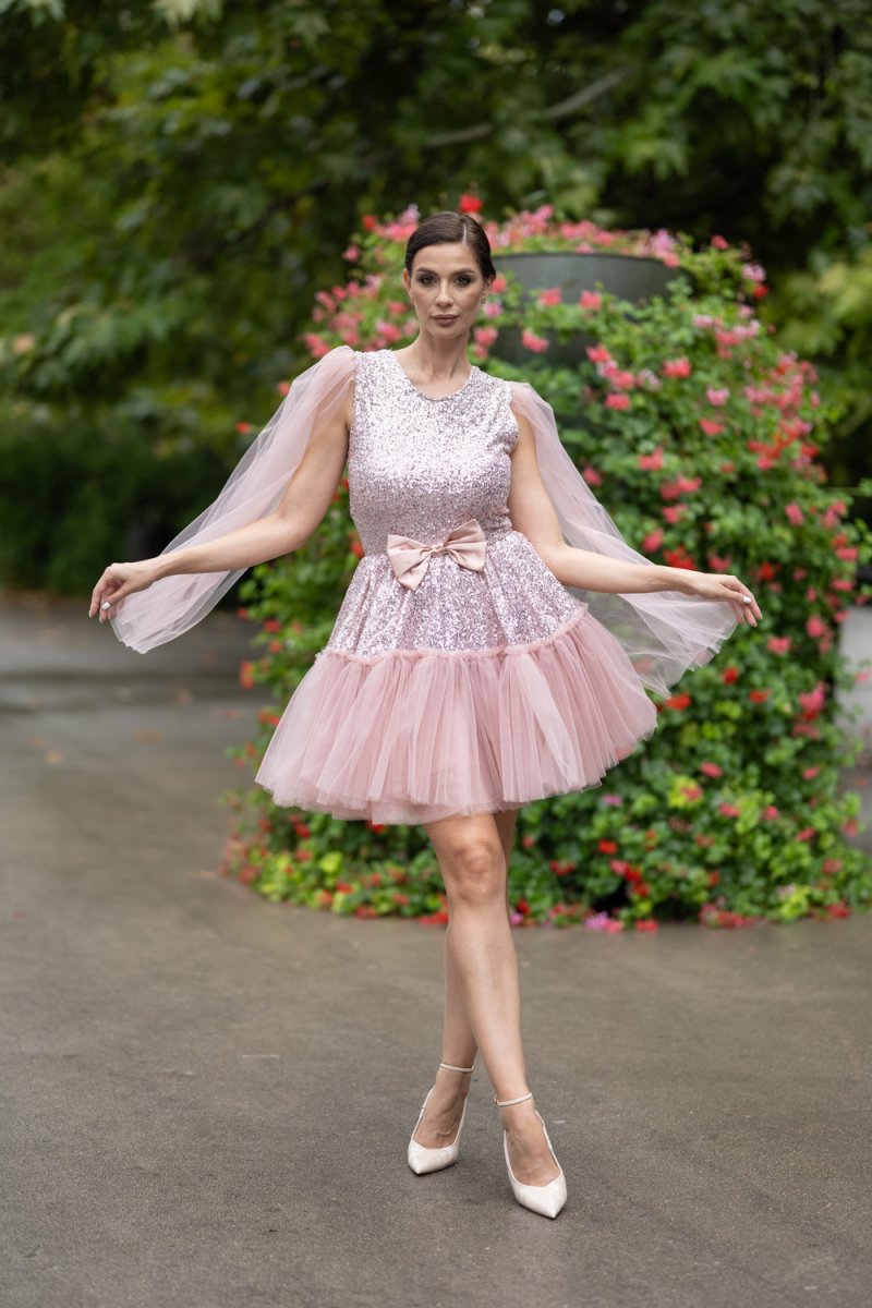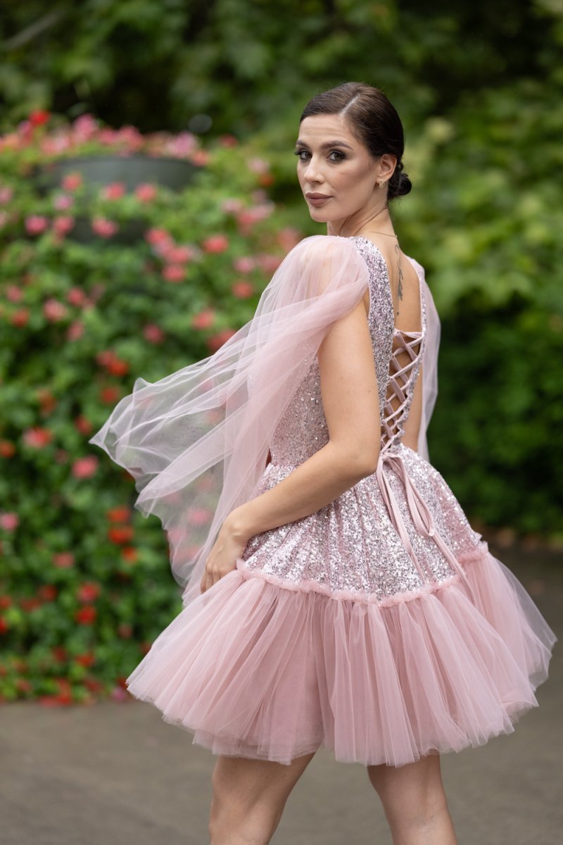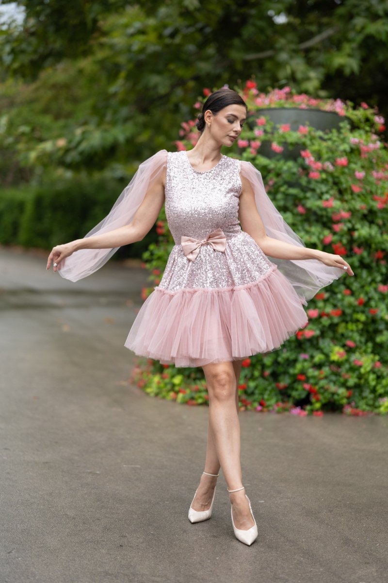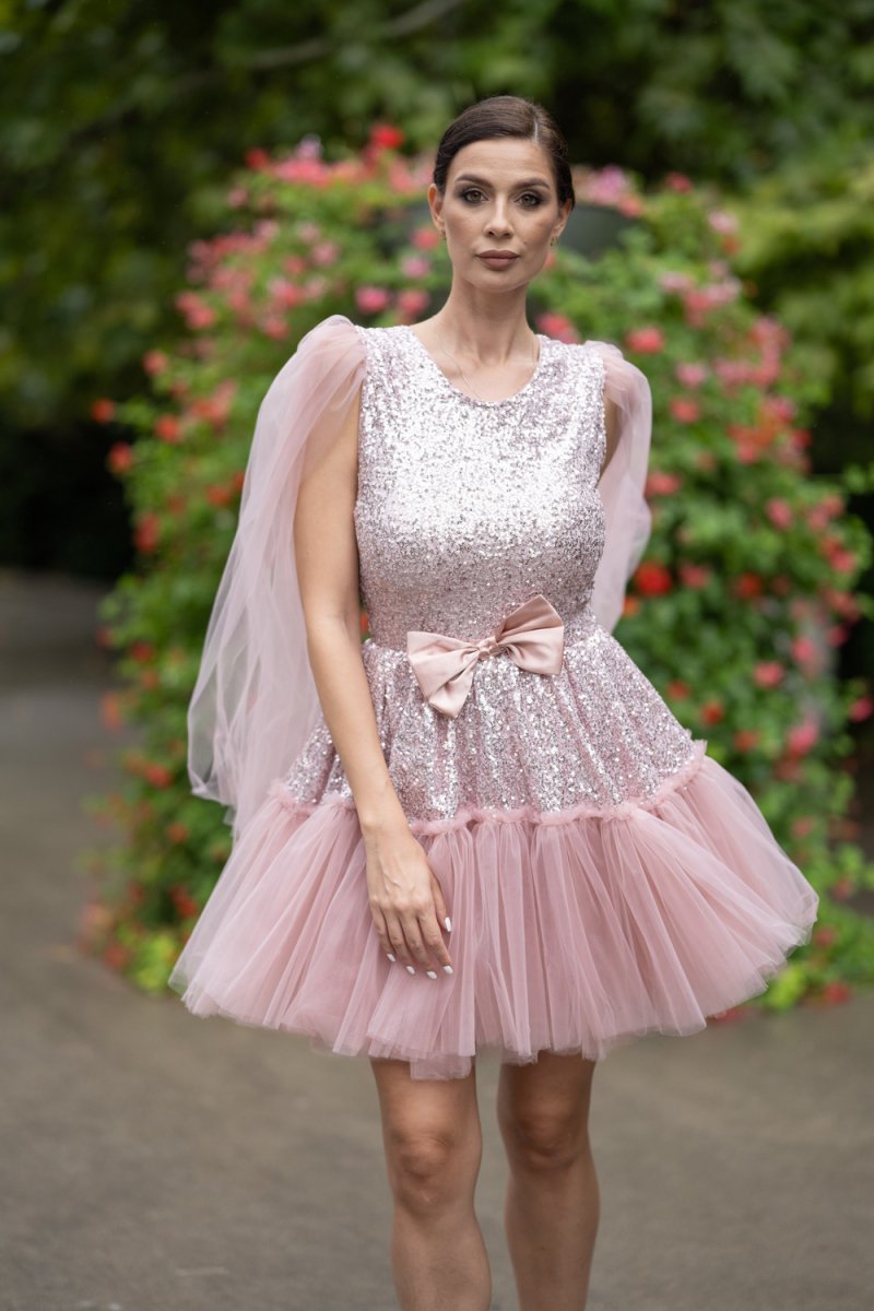Елегантна и ефектна, дамската рокля в пудра розово съчетава блясък и романтика. Горната част е обсипана с пайети, талията е подчертана със сатенена панделка, а полата е от пухкав многопластов тюл. Ефирните воали на раменете и корсетният гръб с връзки добавят финалната доза изящество.