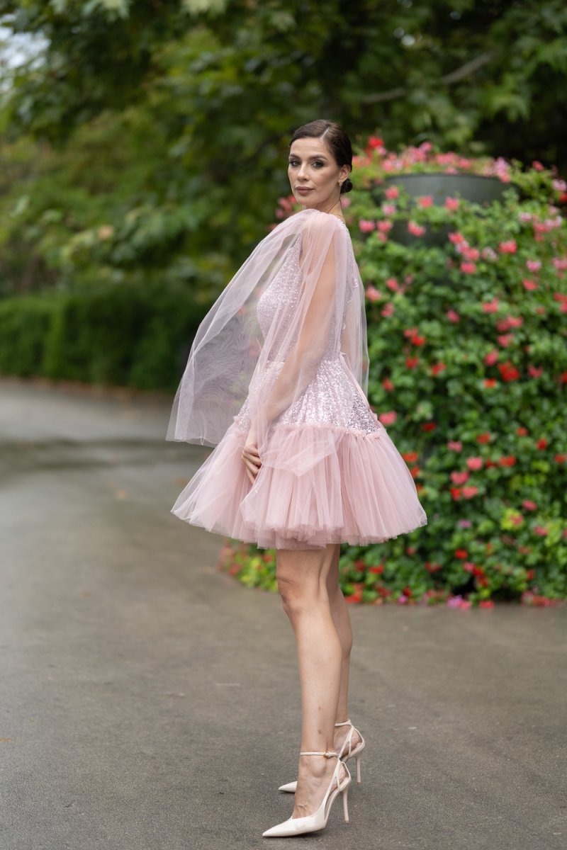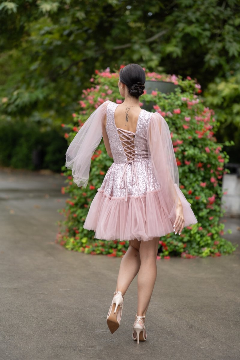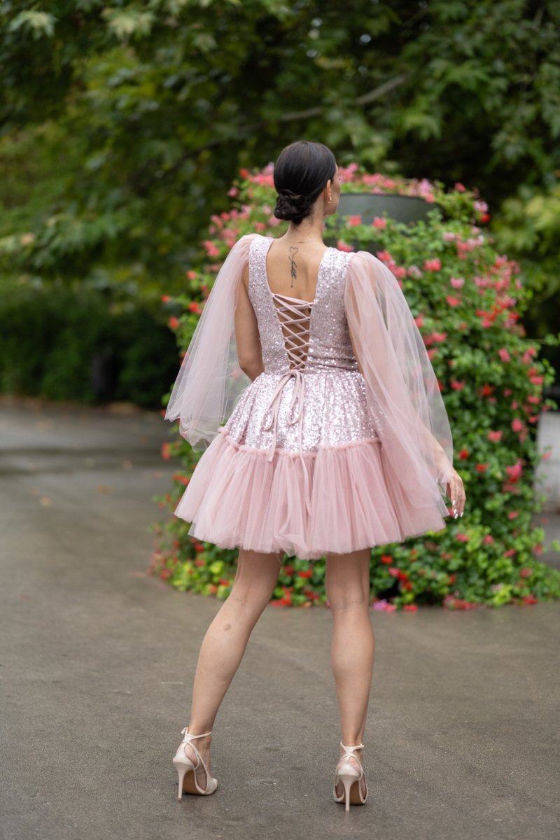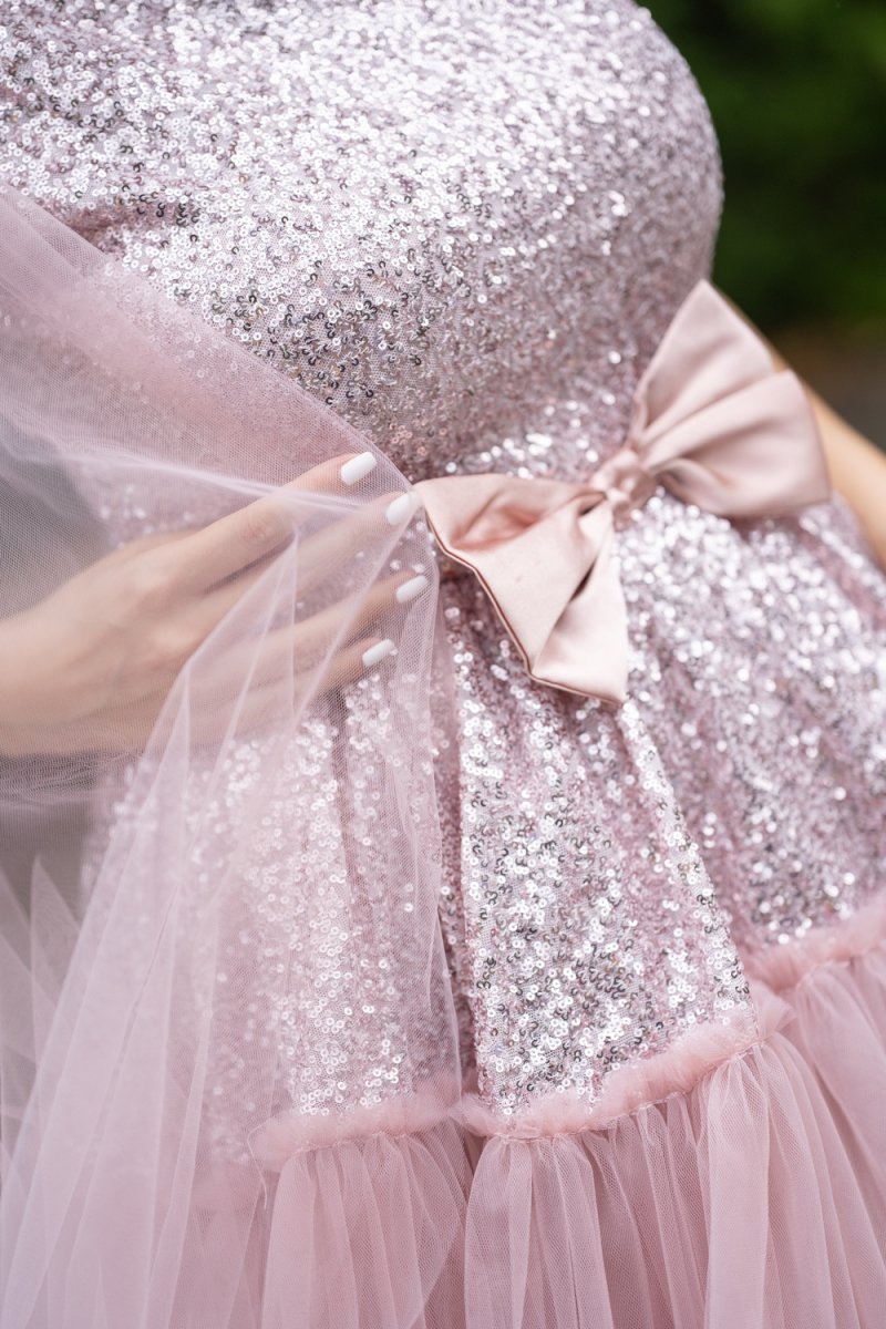 Елегантна и ефектна, дамската рокля в пудра розово съчетава блясък и романтика. Горната част е обсипана с пайети, талията е подчертана със сатенена панделка, а полата е от пухкав многопластов тюл. Ефирните воали на раменете и корсетният гръб с връзки добавят финалната доза изящество.