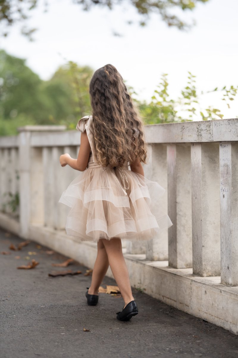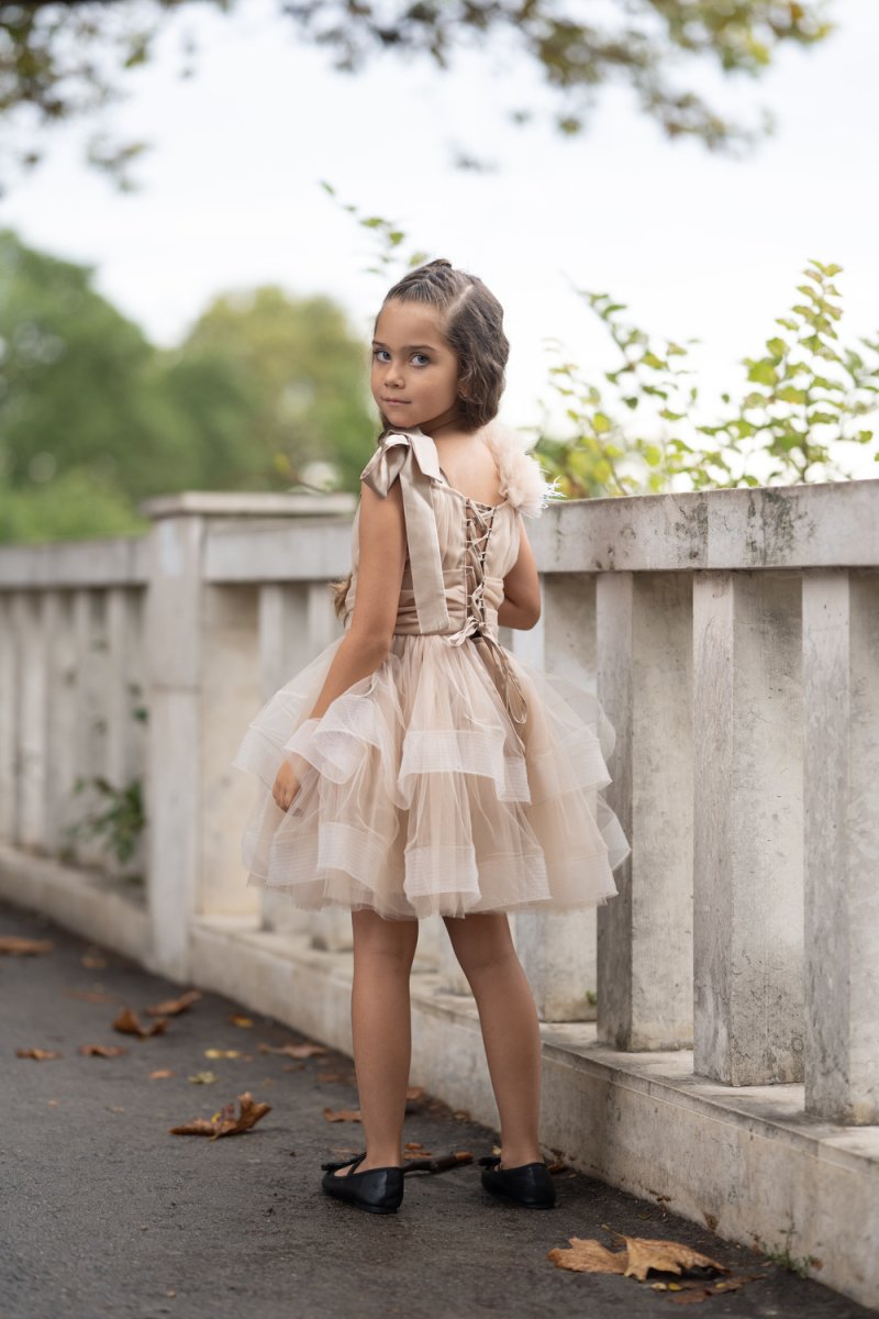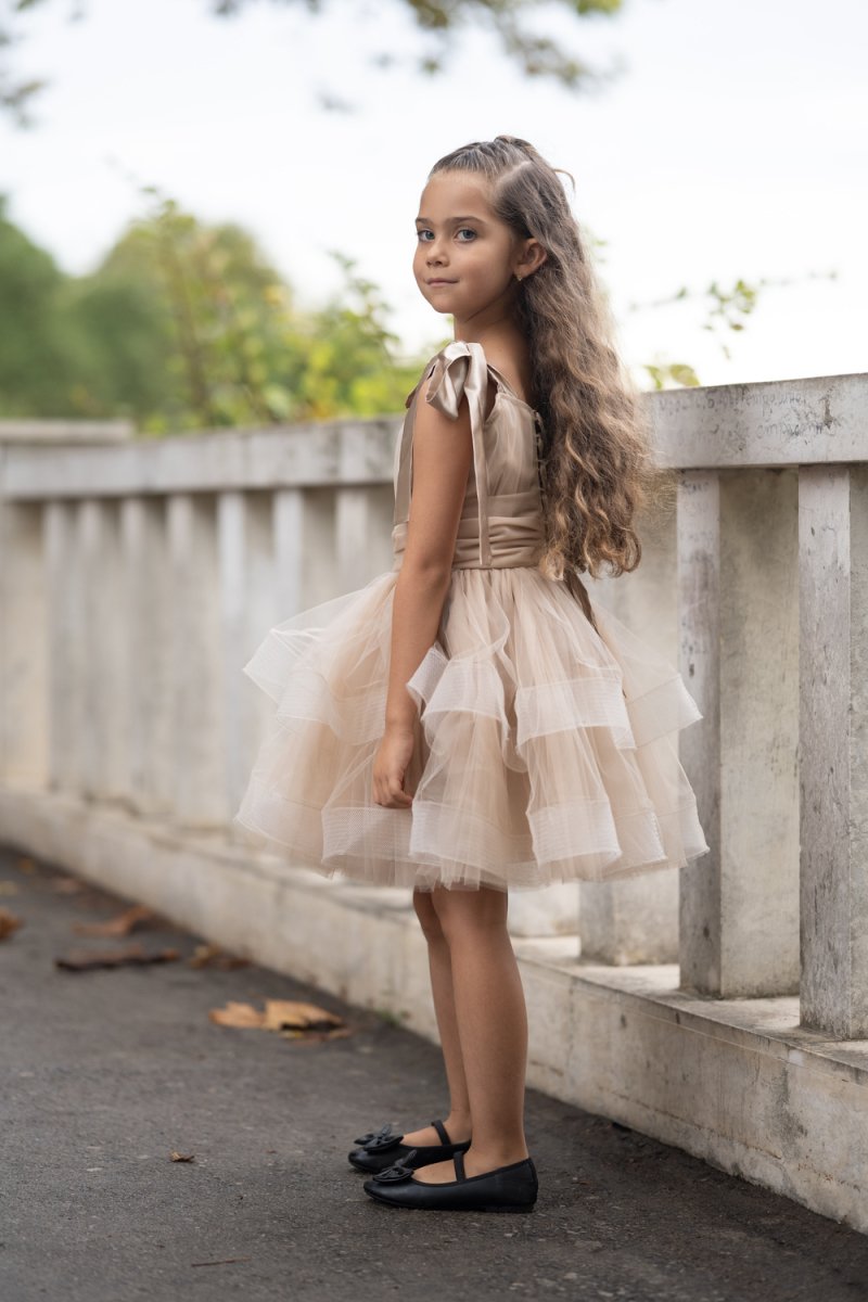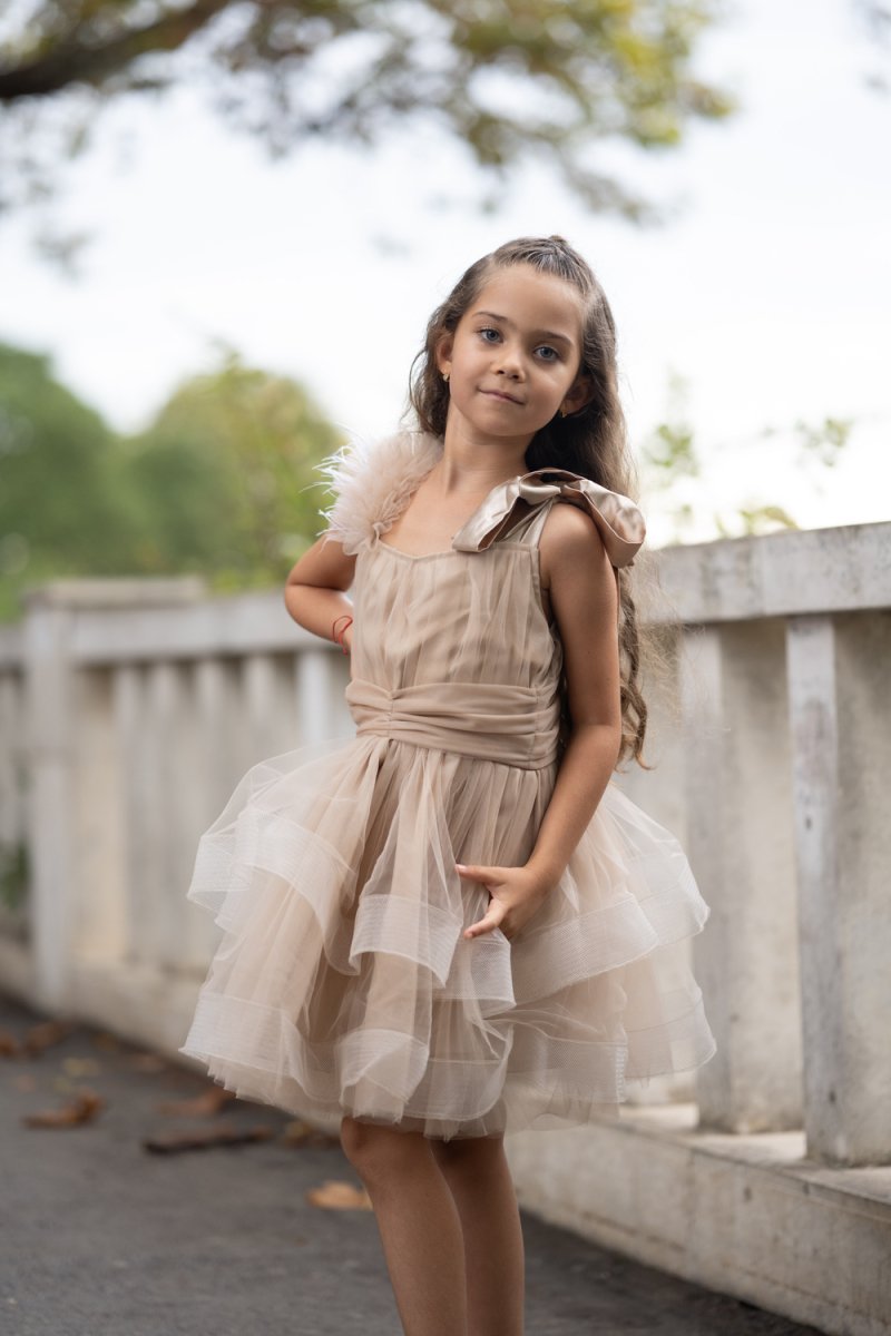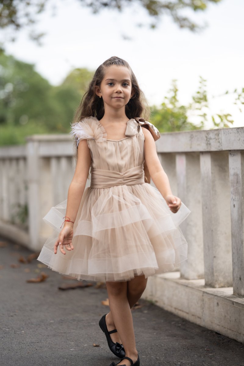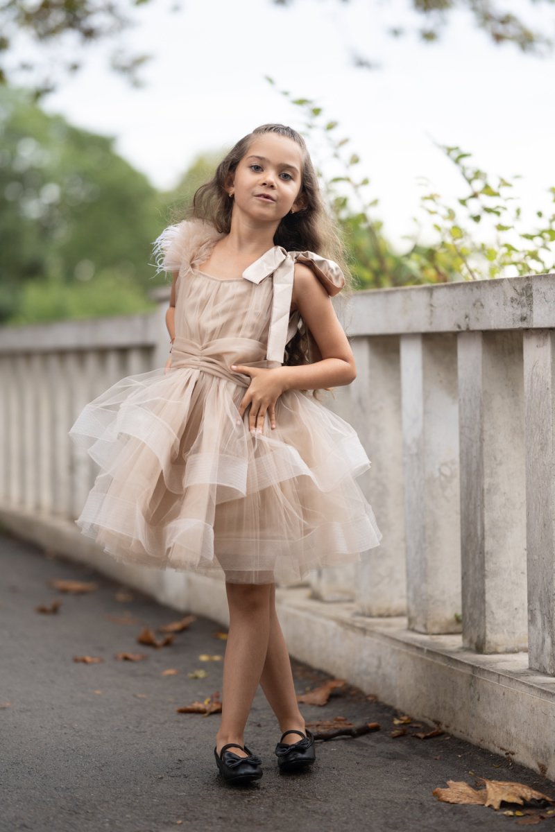 Детската рокля е изработена от ефирен бежов тюл с многопластова пола и подплата за комфорт. Акцентът е поставен върху кокетната сатенена панделка и нежните перца на рамото, които превръщат модела в истинска празнична рокля.