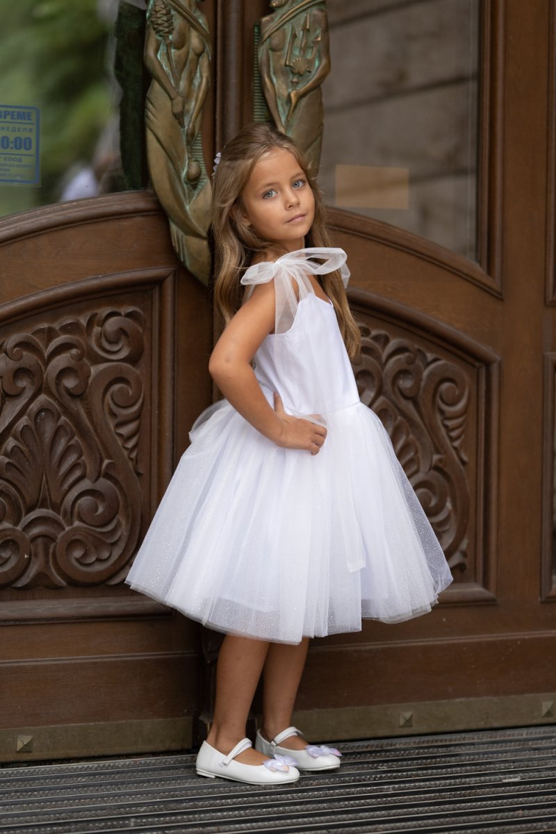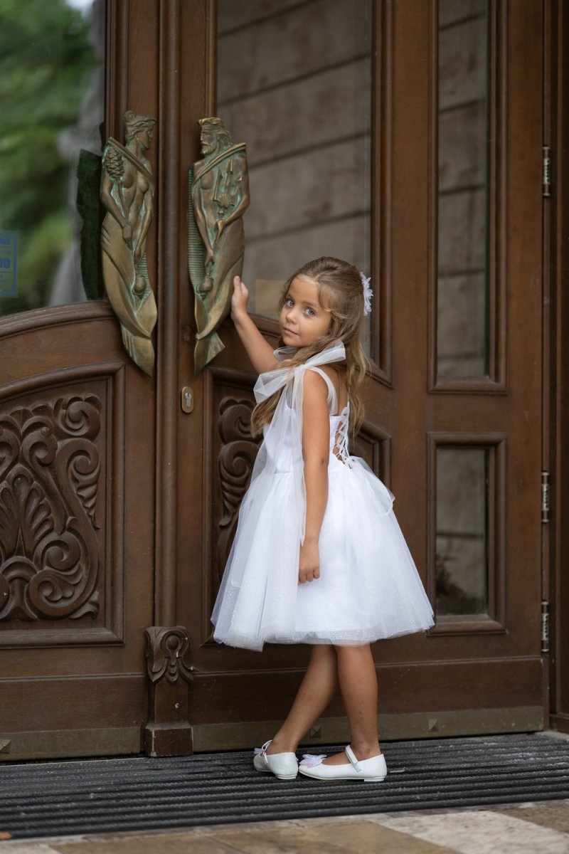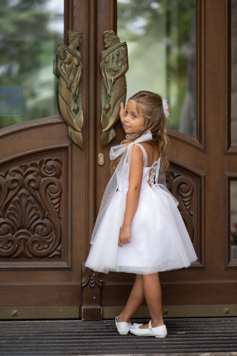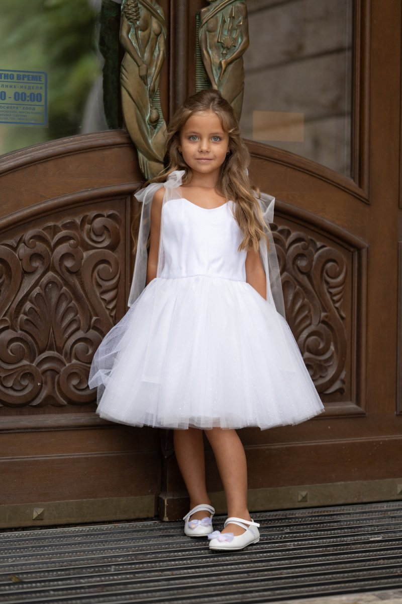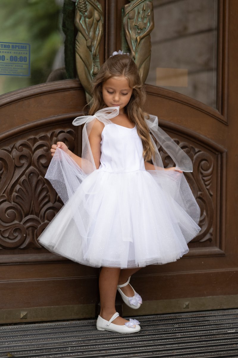 Детската рокля е създадена за малки принцеси – изработена от бяла материя с тюл, с разкроена пола и подплата за удобство. Деликатните тюлени панделки на раменете и връзките на гърба придават празничен и ефирен вид.