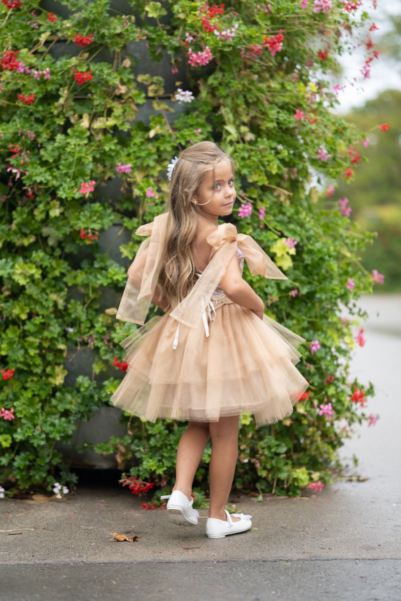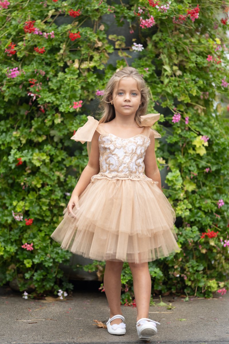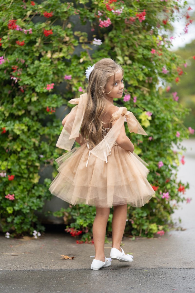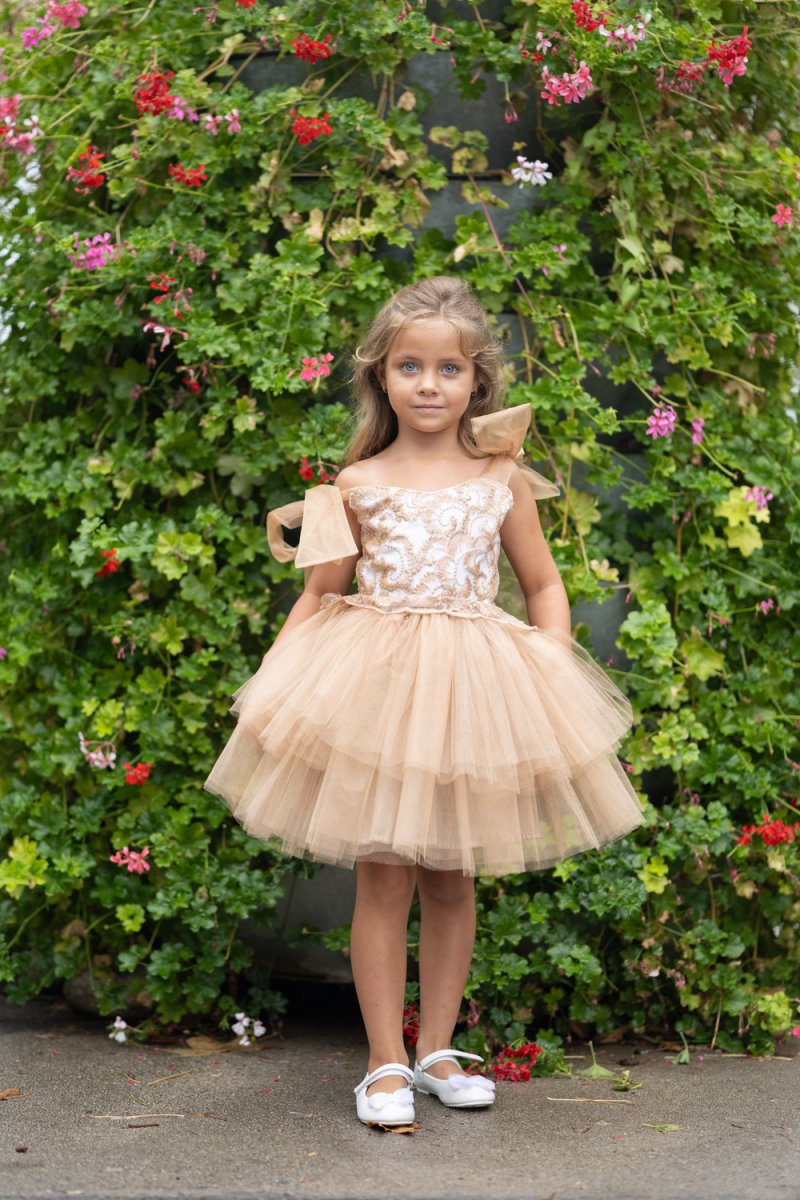Детският модел съчетава горна част от златна дантела и пухкава многопластова пола от карамелен тюл. Раменете са украсени с нежни панделки, а подплатата осигурява комфорт.