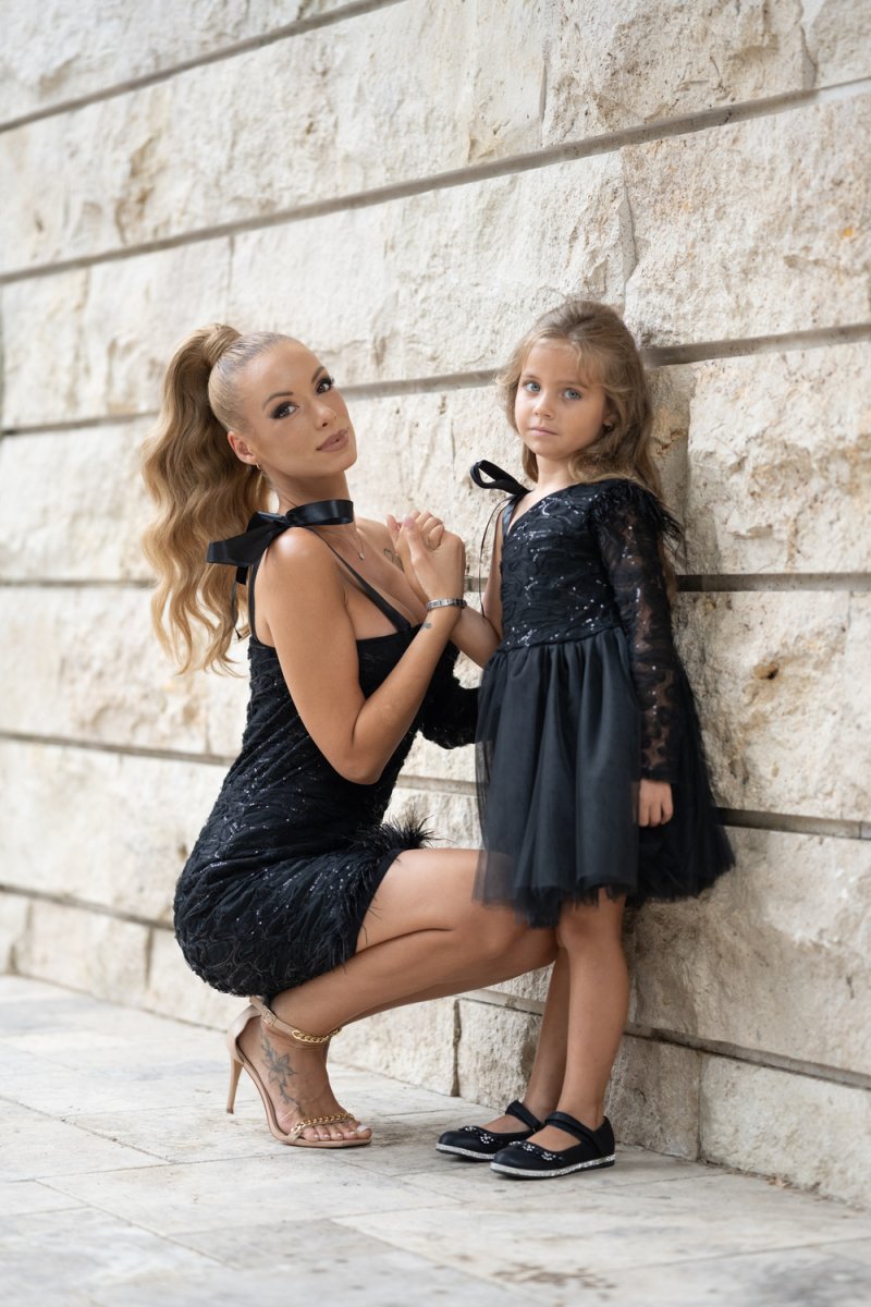 Комплектът „Майка и дъщеря“ е създаден за смели и модерни дами, които искат да блестят заедно. Дамската рокля е с асиметричен дизайн – едно рамо, акценти от пера и фина дантела с пайети. Детската рокля е адаптирана за малки принцеси – с дълги ръкави от дантела, тюлена разкроена пола и перца на раменете за завършен празничен ефект.