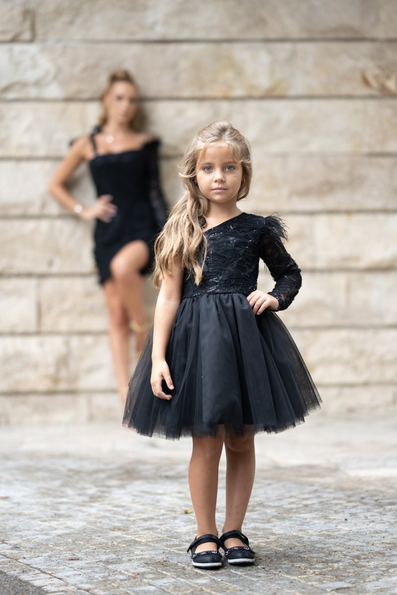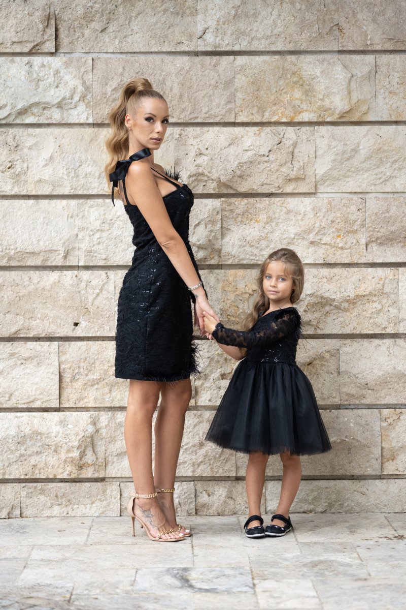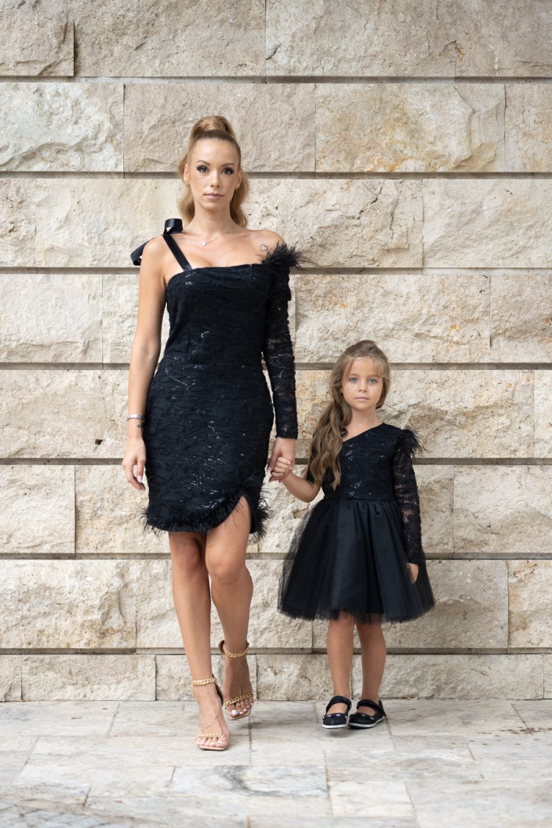 Начало КОЛЕКЦИЯ РОКЛИ ЗА МАЙКА И ДЪЩЕРЯ Комплект рокли за майка и дъщеря от черна дантела с пера