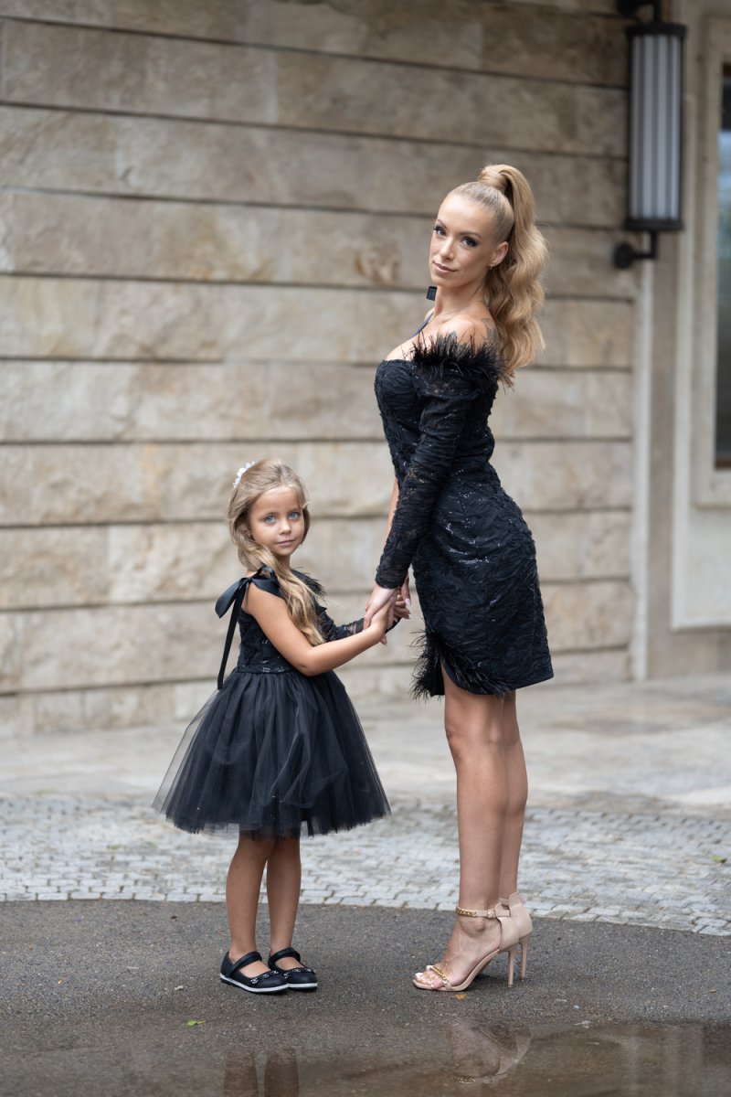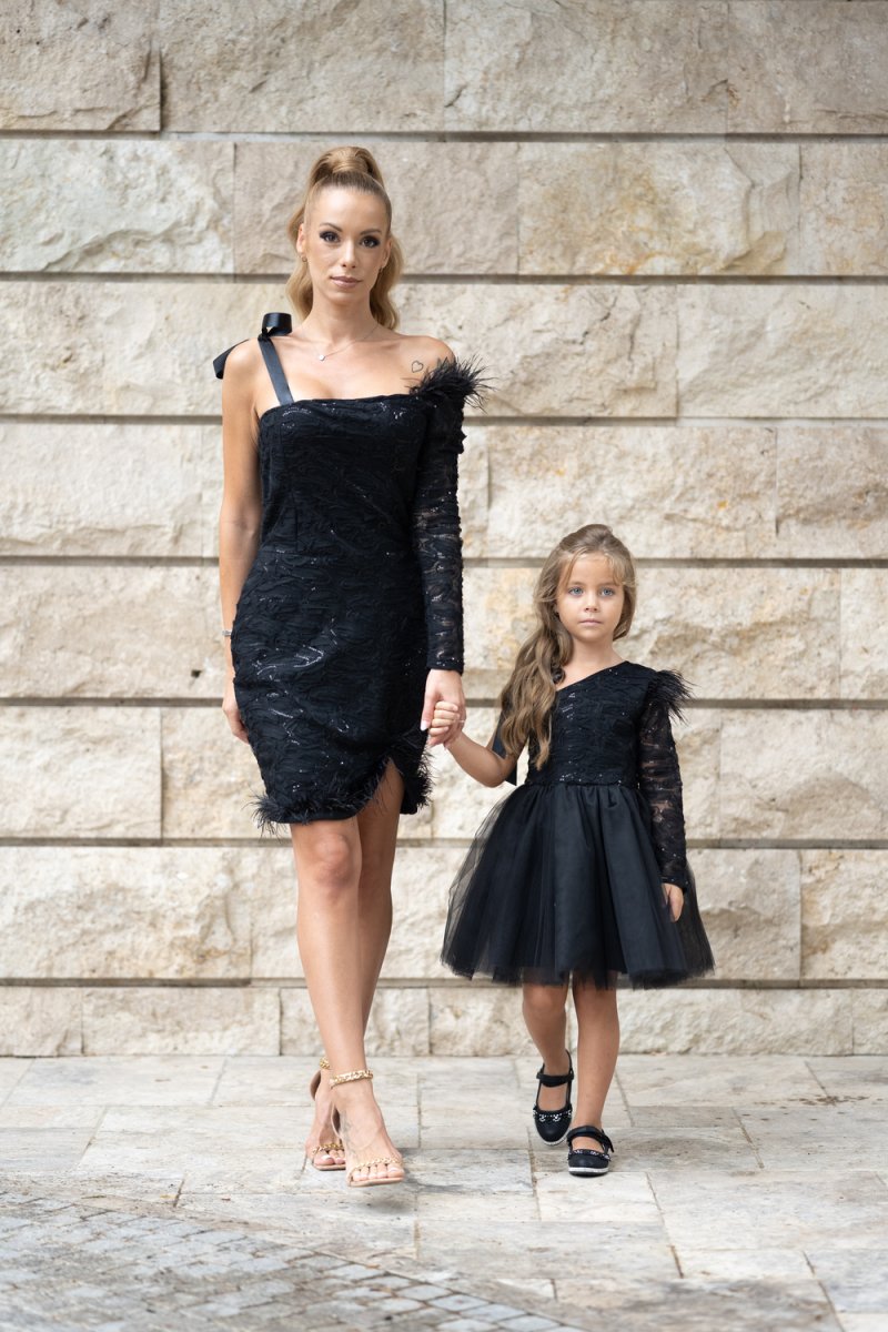 Комплект рокли за майка и дъщеря от черна дантела с пера