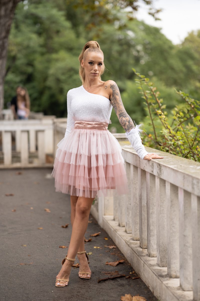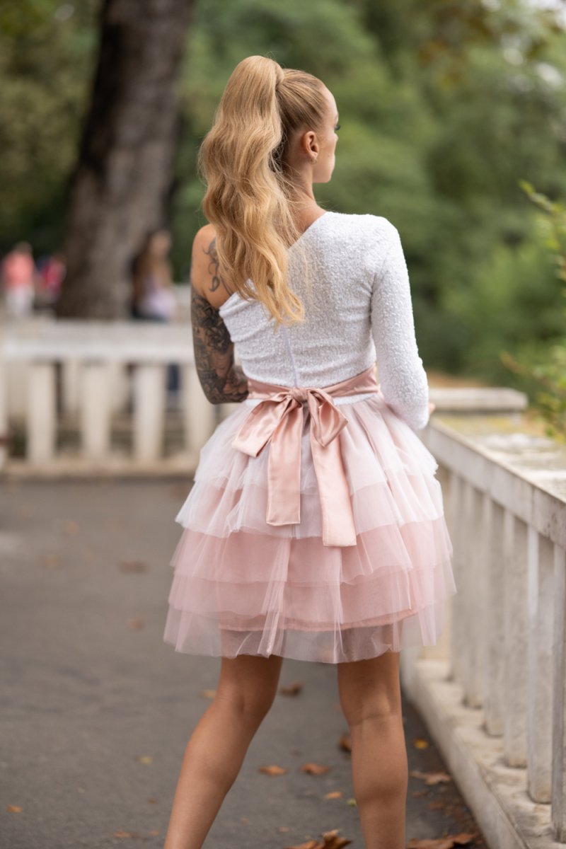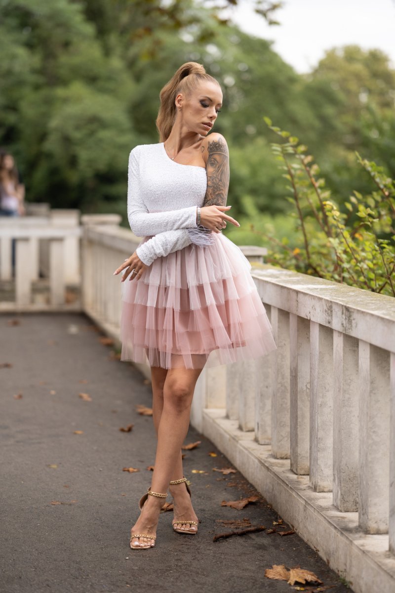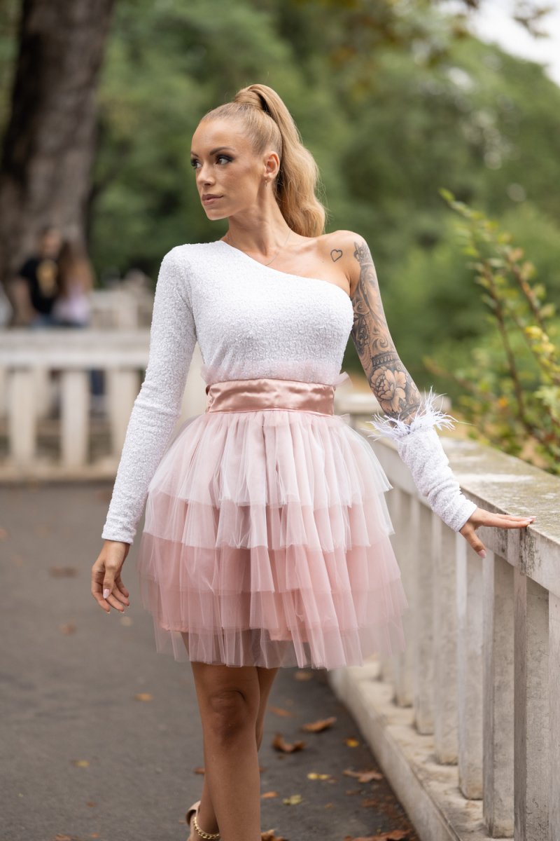 Горната част е от бели пайети, едно рамо и дълъг ръкав, втори къс украсен с нежни пера. Полата е обемна, изработена от многопластов пудрено розов тюл, завършена с широк сатенен колан с панделка.