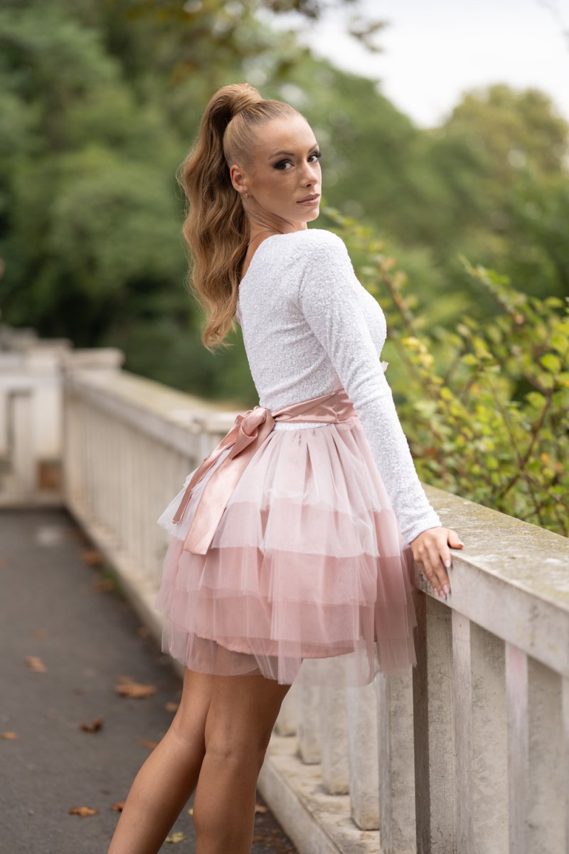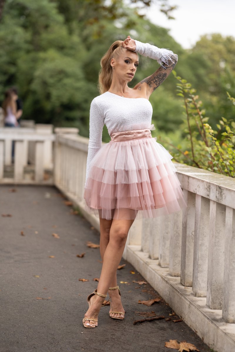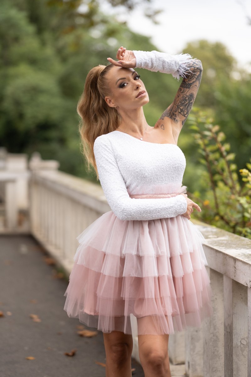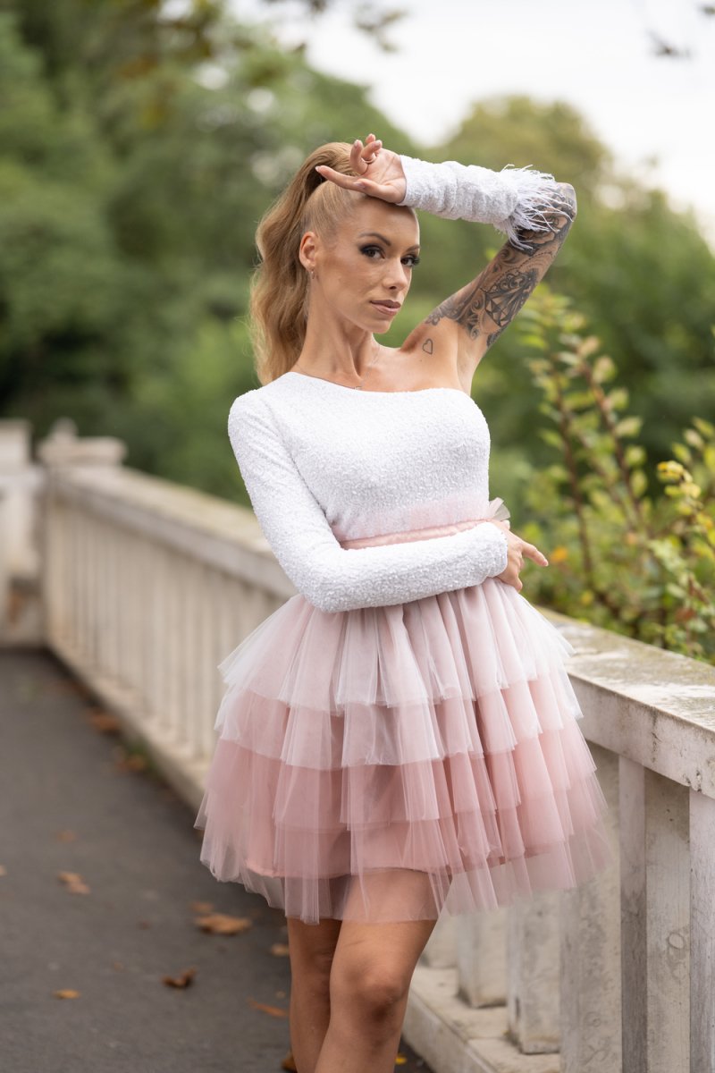 Горната част е от бели пайети, едно рамо и дълъг ръкав, втори къс украсен с нежни пера. Полата е обемна, изработена от многопластов пудрено розов тюл, завършена с широк сатенен колан с панделка.