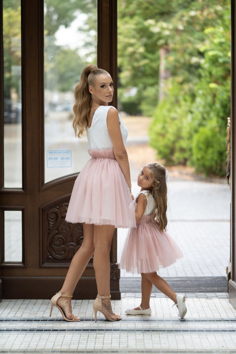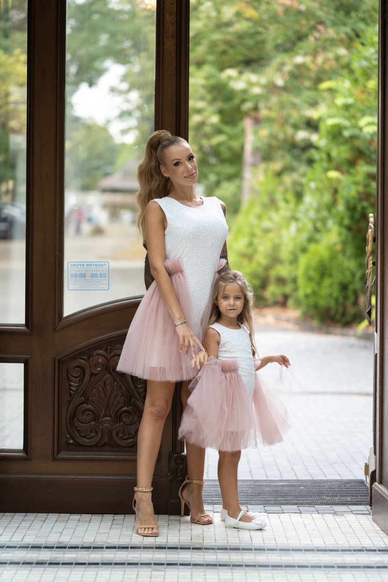Начало КОЛЕКЦИЯ РОКЛИ ЗА МАЙКА И ДЪЩЕРЯ Комплект рокли за майка и дъщеря от бели пайети с подвижна тюлена пола