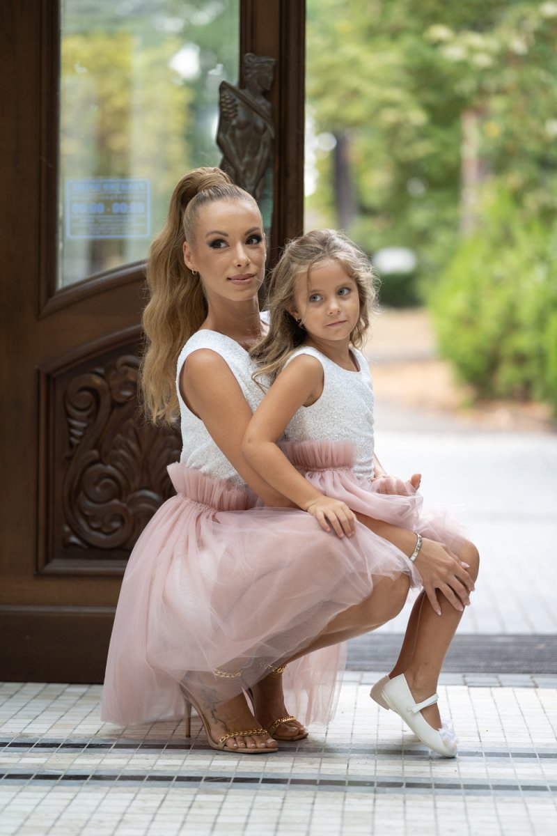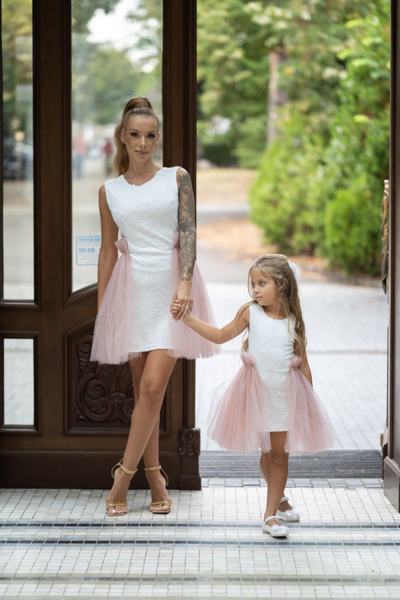 Комплект рокли за майка и дъщеря от бели пайети с подвижна тюлена пола