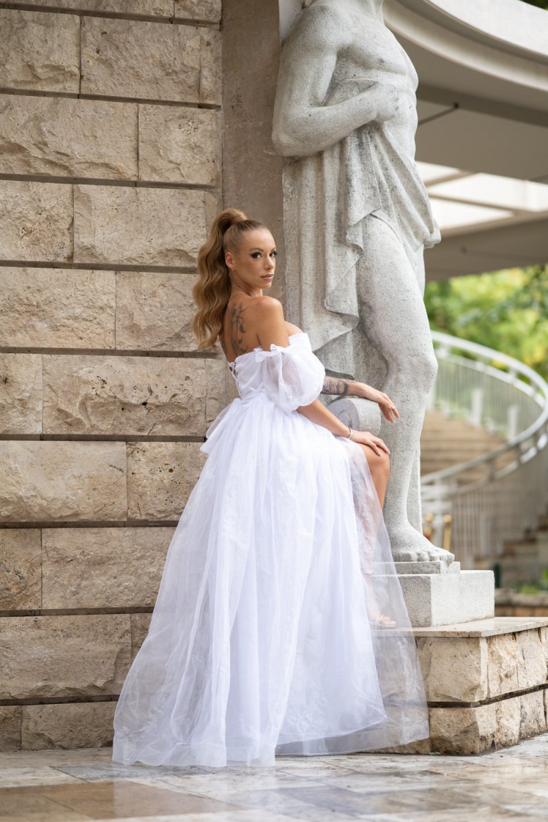 Създадена да впечатлява, тази рокля от органза е истински символ на елегантност. Корсетен силует, буфан ръкави и дълъг шлейф, който придава изящество.