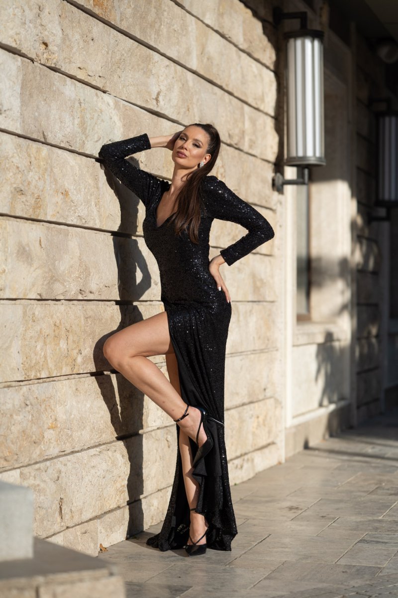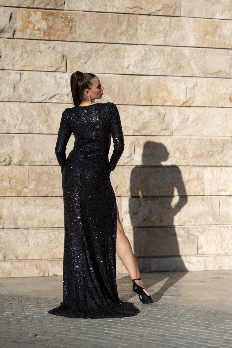 Когато женствеността срещне силата – резултатът е тази рокля. Този модел е изключителен – комбинацията от дълги ръкави, пайети и смела цепка го прави едновременно елегантен и провокативен. Черната пайетена визия с дълги ръкави и смела цепка носи едновременно класа и дръзка увереност. Вталеният силует подчертава формите, докато пайетите превръщат всяко движение в светлинен спектакъл. Това е рокля за жени, които не просто присъстват, а властват.