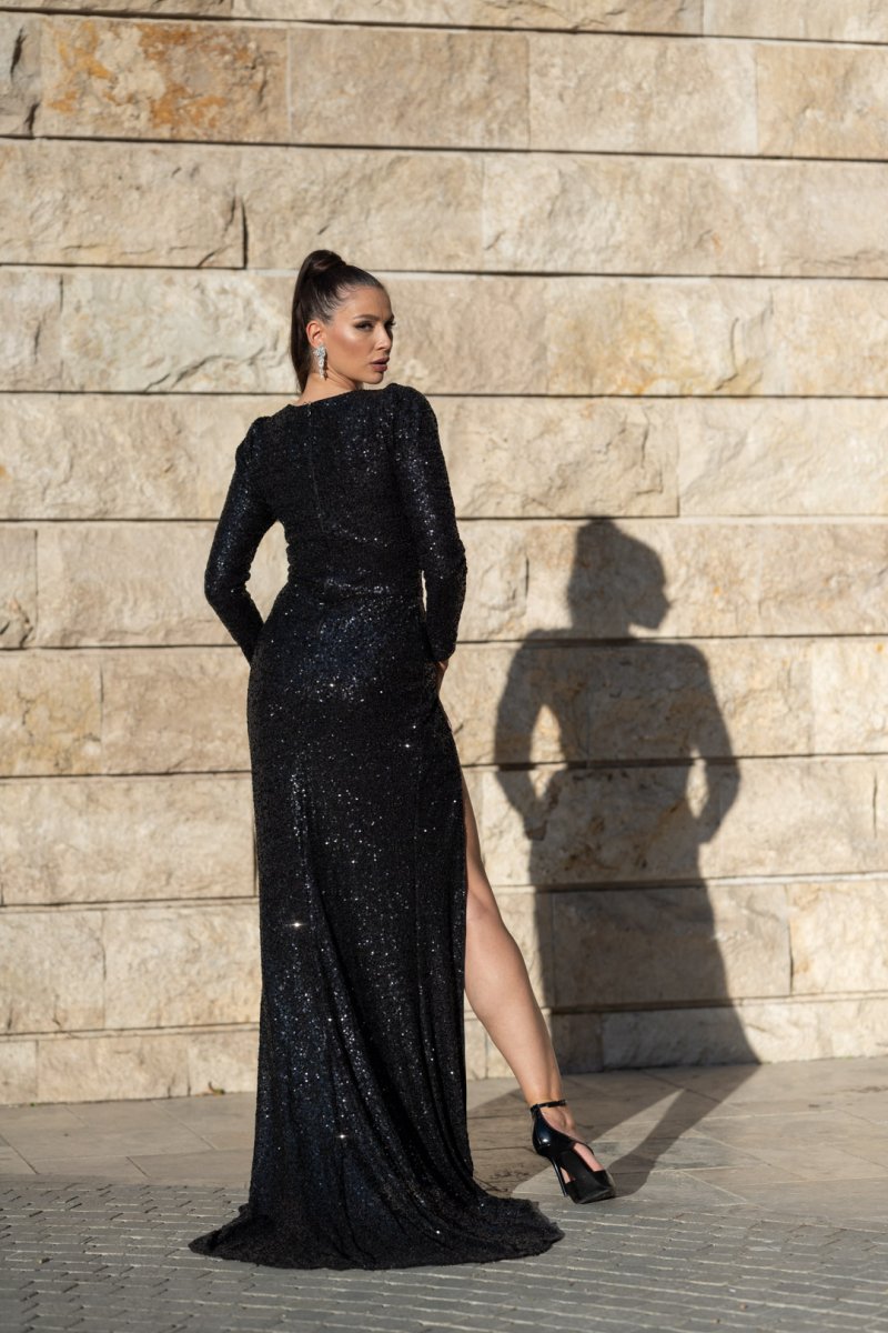 Черна пайетена рокля с дълги ръкави и висока цепка