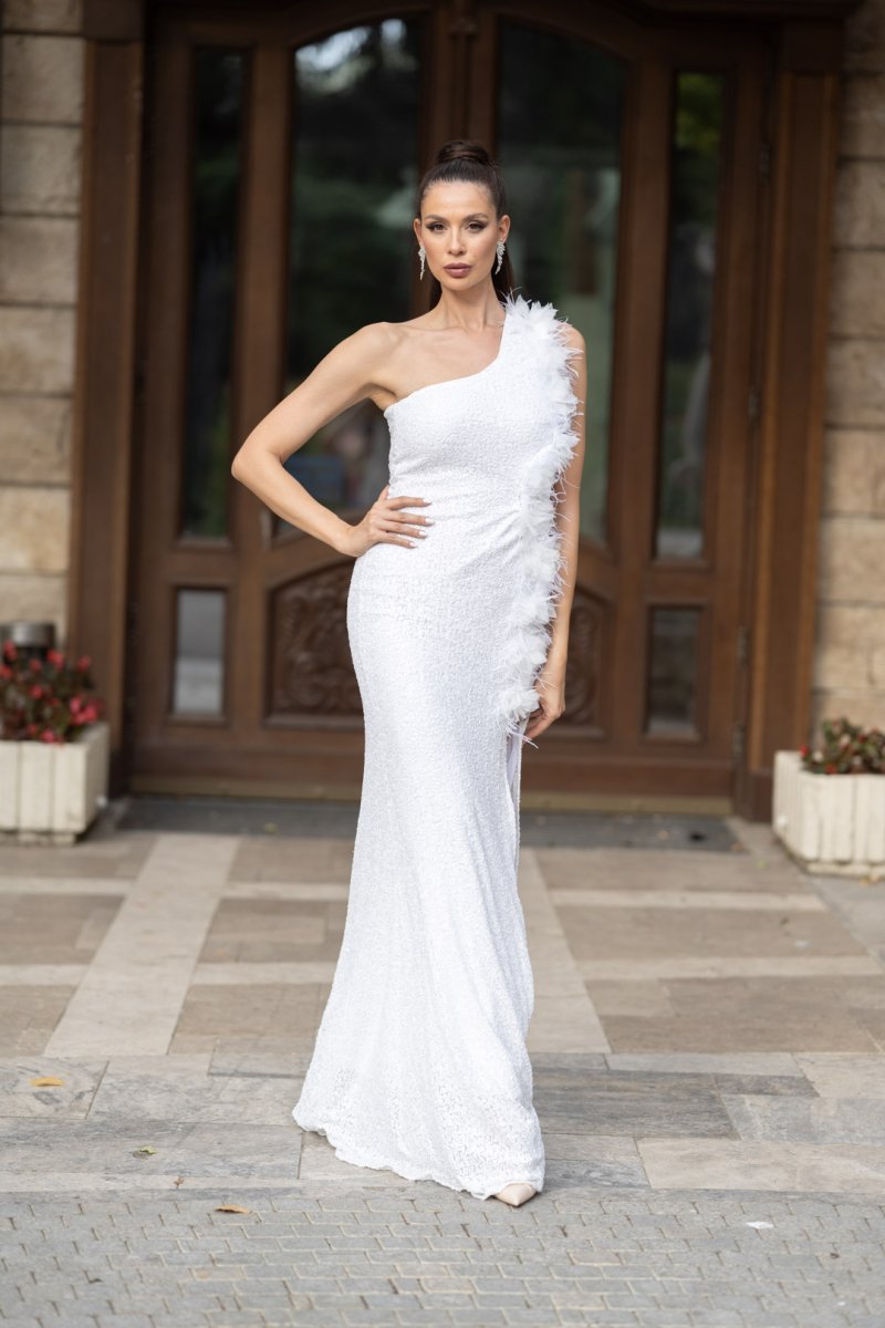 Дълга бяла рокля от пайети с едно рамо и акценти цветя и пера