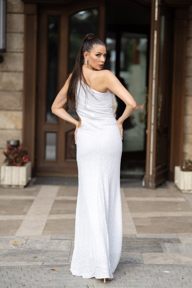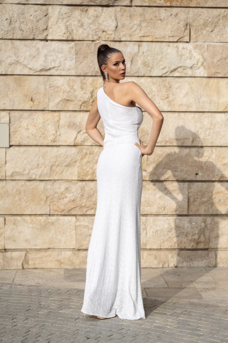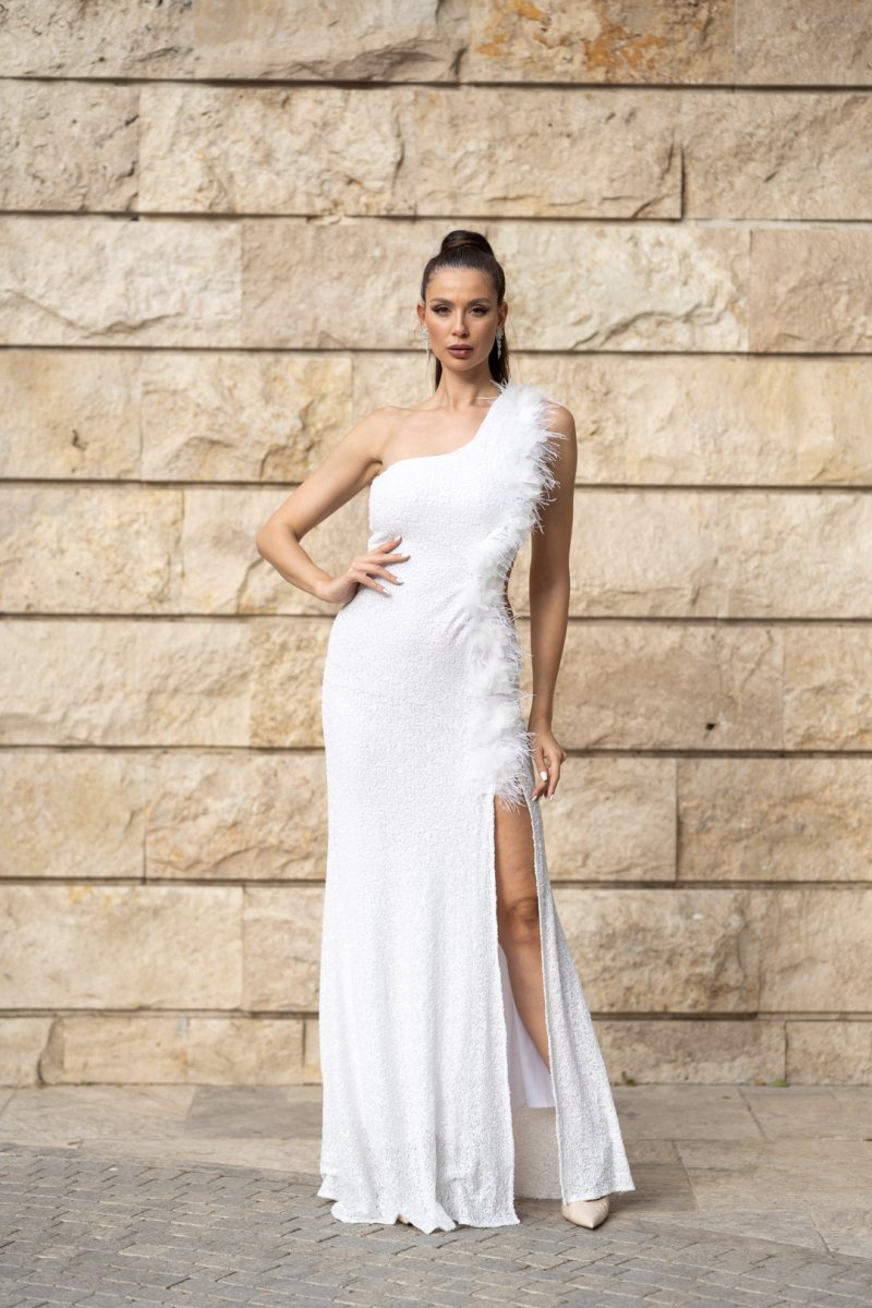 Създадена за моменти, които остават във вечността. Бялата рокля на JNSecret впечатлява с изчистена линия с едно рамо, обсипана с бляскави пайети. Високата цепка добавя доза смелост, а нежните пера и цветя по дължината на силуета придават уникален акцент и движение. Тя е изборът на жената, която иска да сияе – независимо дали на бал, сватба или специално събитие.