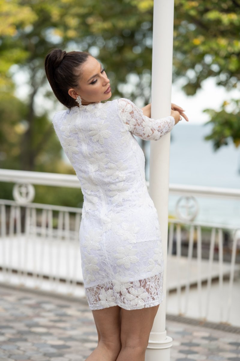 Къса бяла рокля с дълги ръкави от дантела с пайети