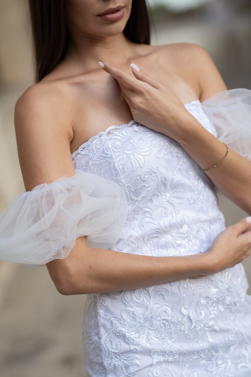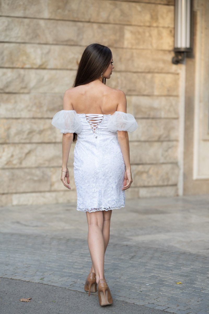 Създадена от фина дантела с деликатен релеф и акцентни тюлени ръкави, тази къса рокля е въплъщение на елегантност и нежност. Корсетният гръб подчертава силуета и придава доза смелост, докато късата дължина гарантира, че ще останеш в центъра на вниманието. Перфектният избор за момичета, които искат да бъдат едновременно изискани и запомнящи се.