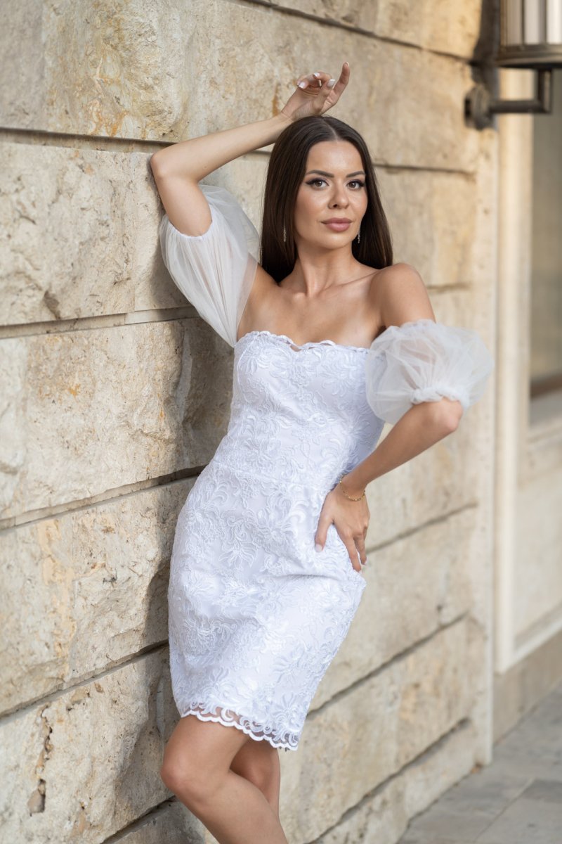Начало ДАМСКИ РОКЛИ Къса бяла рокля от дантела с тюлени ръкави