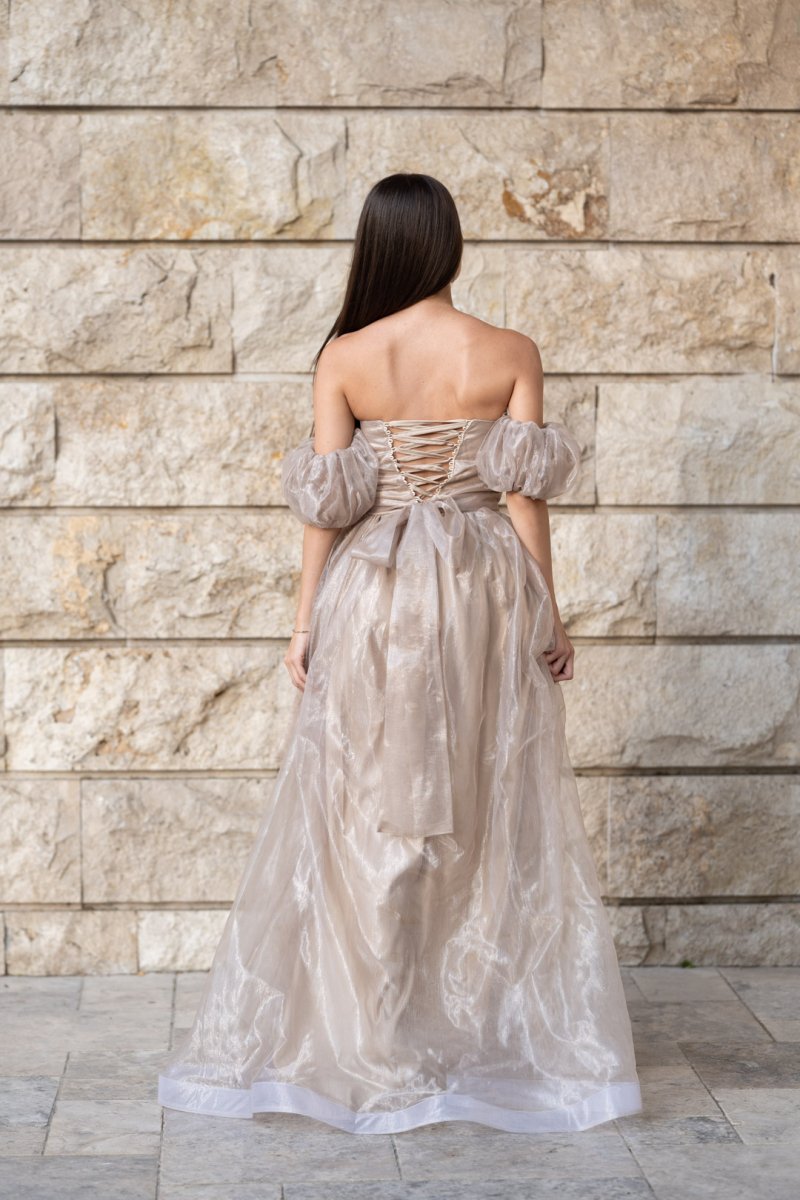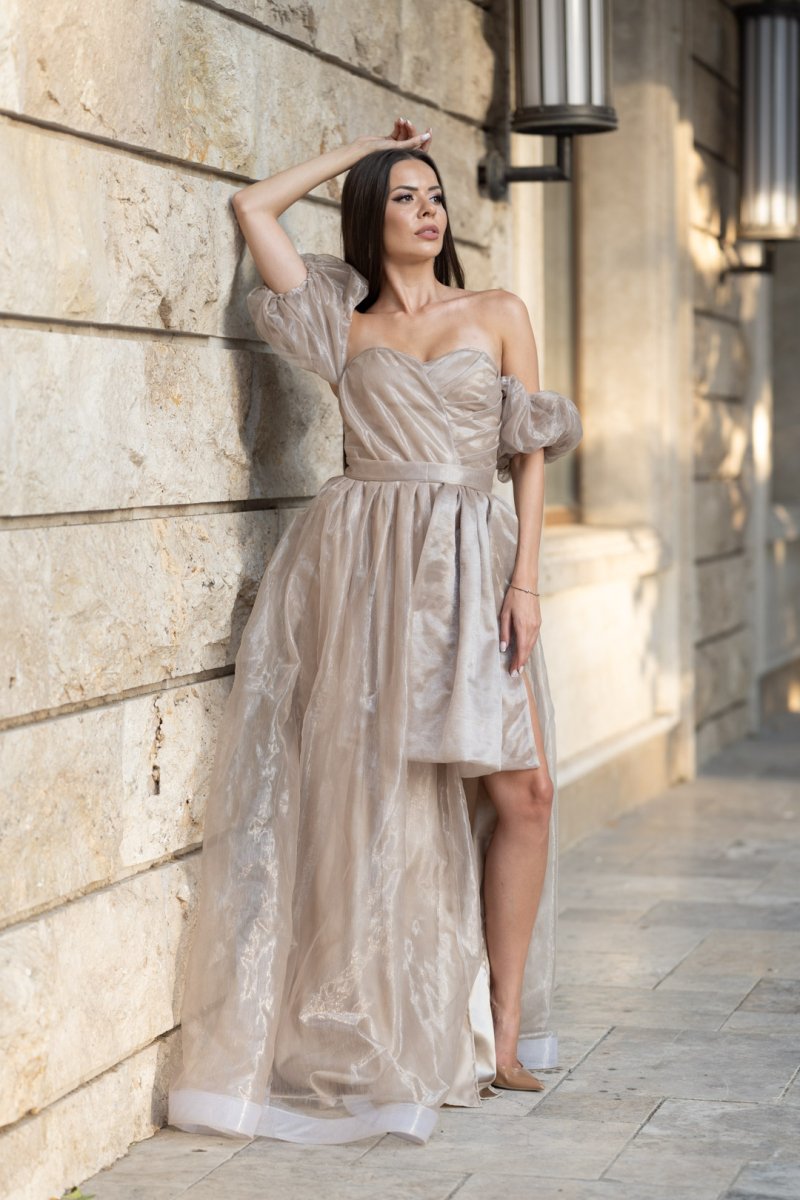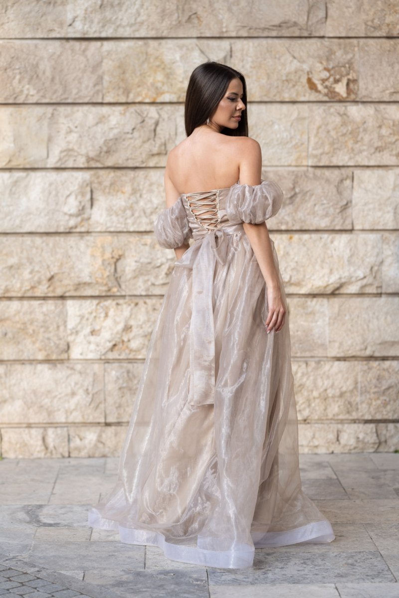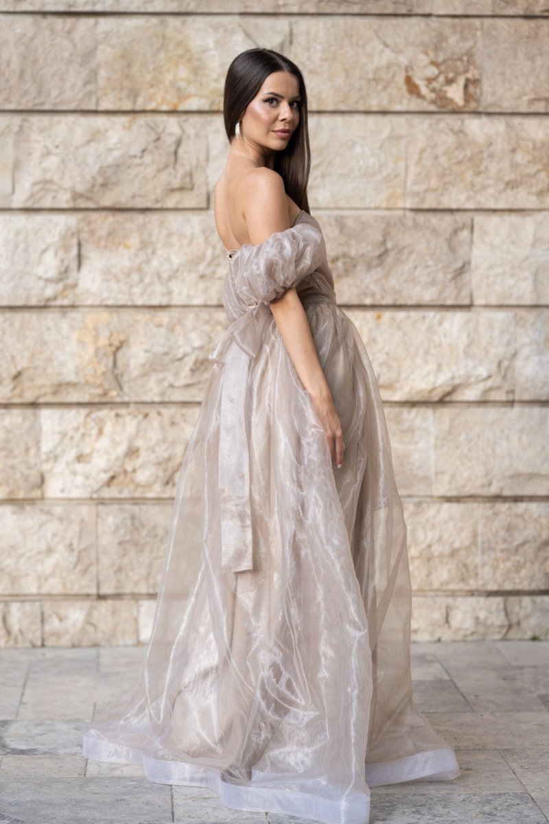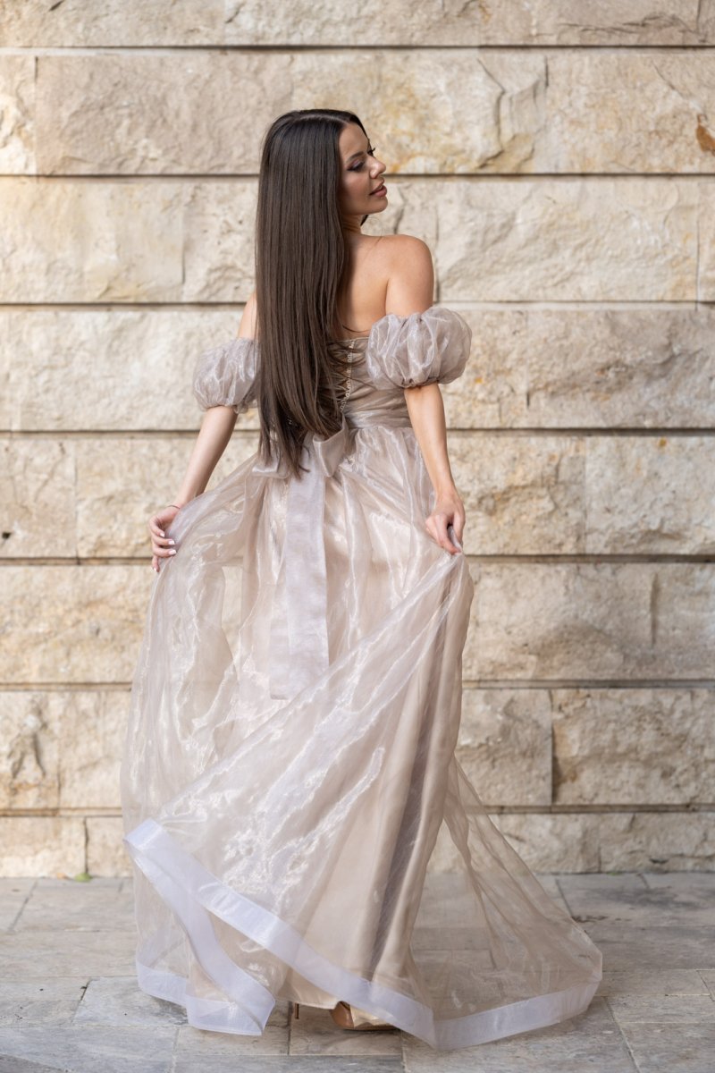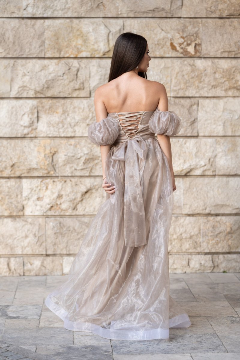 Фината органза създава лекота и обем, корсетният гръб оформя перфектен силует, а обемните ръкави добавят приказен чар. Високата цепка придава доза смелост, която балансира нежността с елегантна провокация.