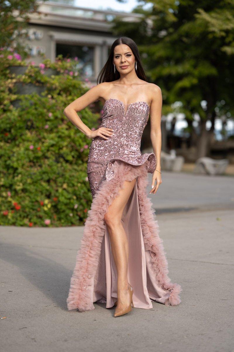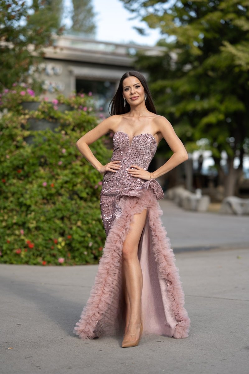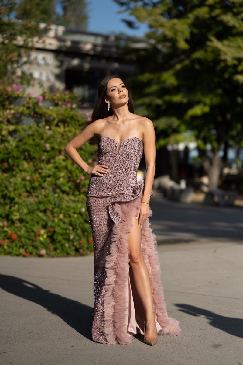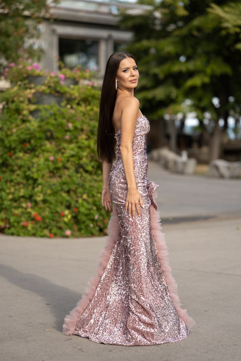 Този модел впечатлява с изящно покритие от розови пайети и впечатляваща висока цепка, подчертана от романтичен тюл, който добавя драма и обем. Корсетният гръб оформя силуета ти като на истинска кралица, а всяка стъпка разкрива нова доза женственост и увереност.