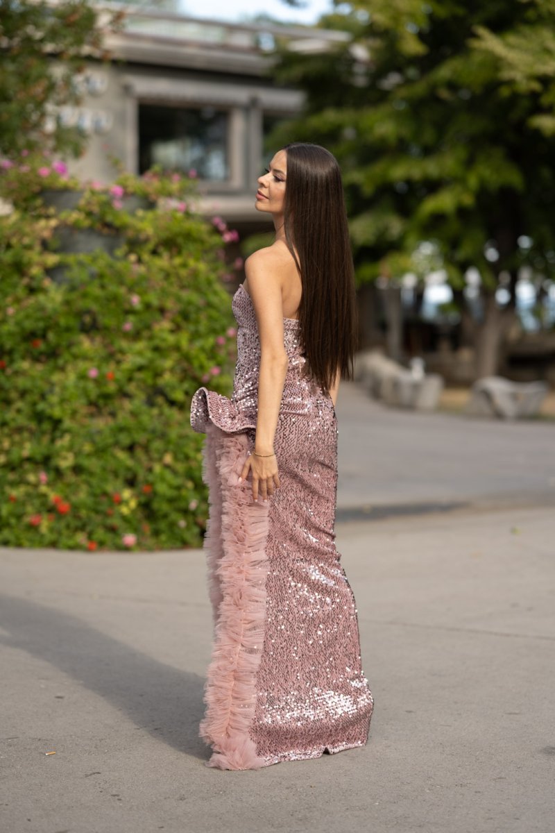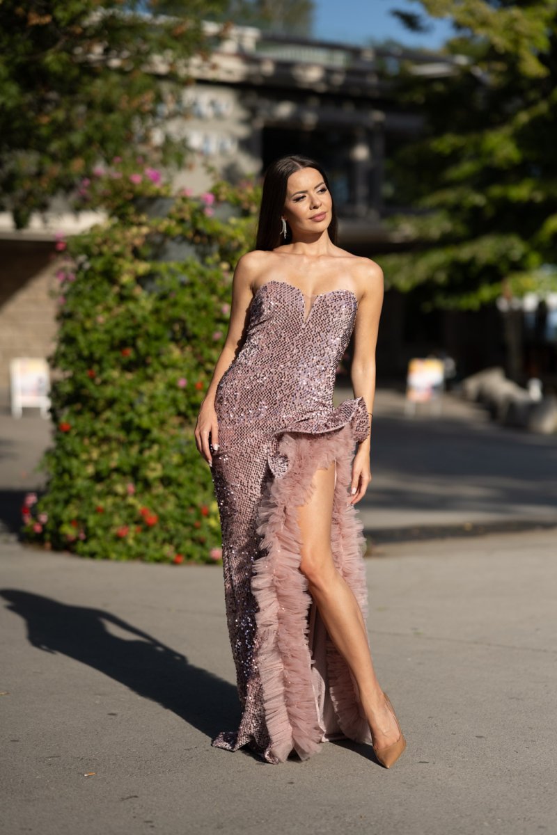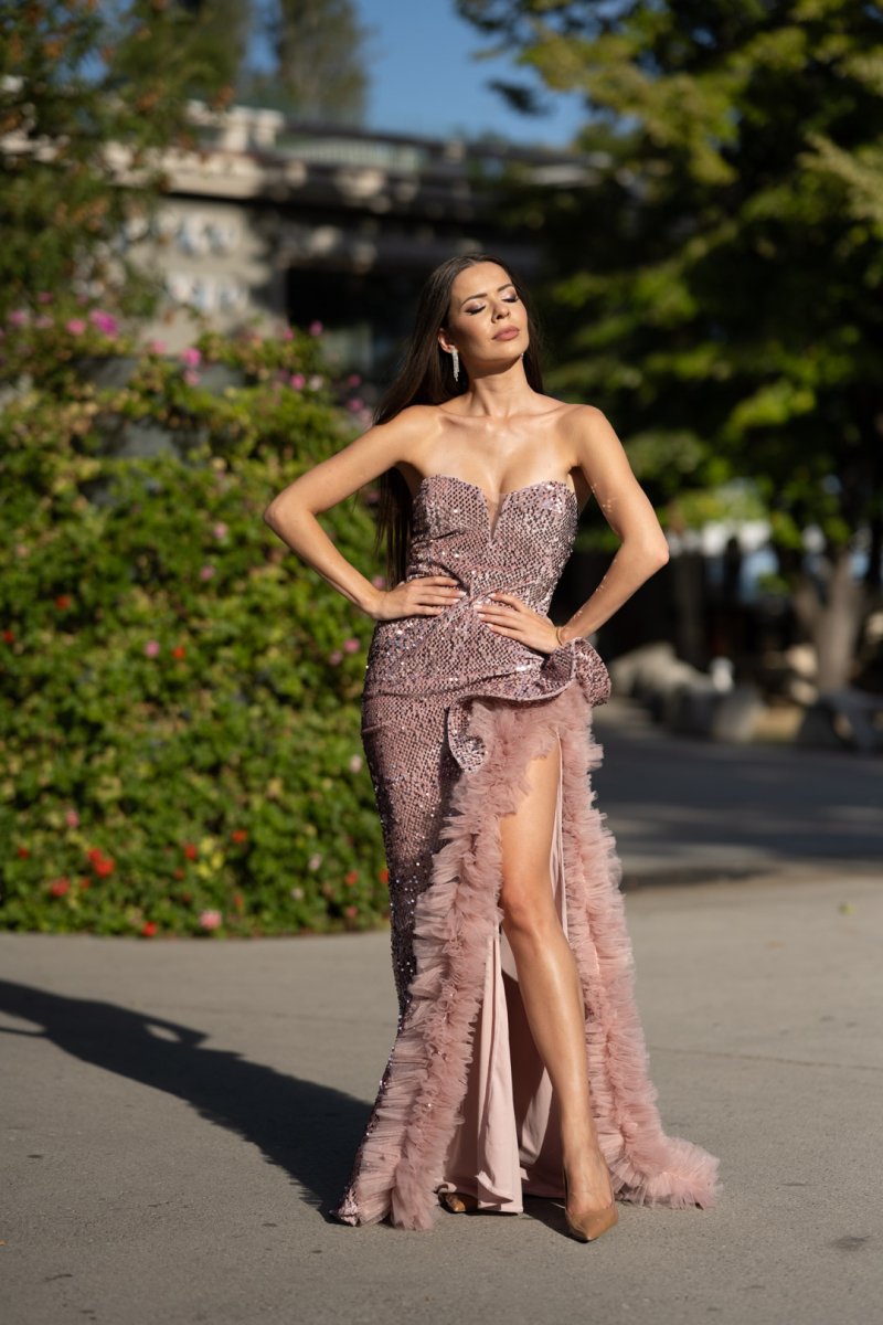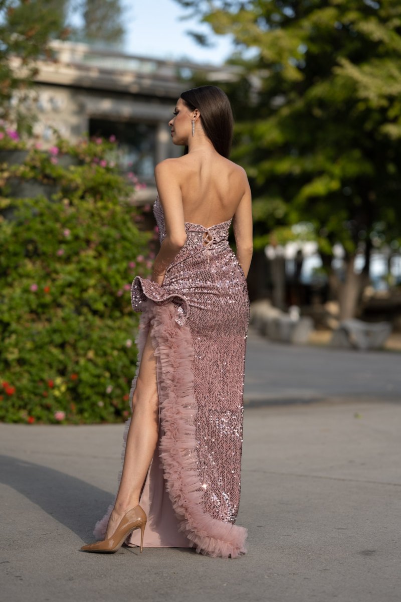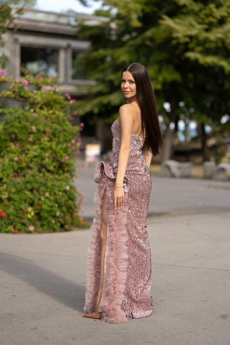 Този модел впечатлява с изящно покритие от розови пайети и впечатляваща висока цепка, подчертана от романтичен тюл, който добавя драма и обем. Корсетният гръб оформя силуета ти като на истинска кралица, а всяка стъпка разкрива нова доза женственост и увереност.
